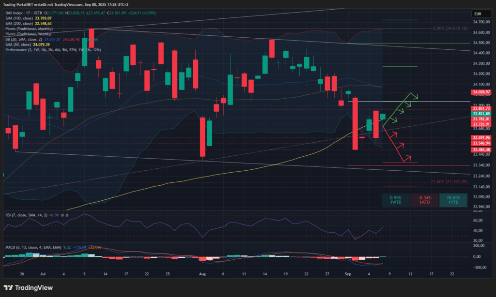 Der DAX bleibt in der Range der Vorwoche, aber die bisherige Erholung zeigt flache Strukturen. Ein stabiler Rücklauf oberhalb der 24.000 wäre aus Sicht der Bullen wichtig; unterhalb können rasch neue Tiefs drohen.
