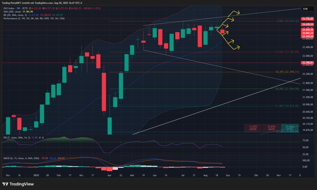 - Oberhalb bleibt der Cluster zur 24.175 und 24.210 aktiv. Darüber wieder die Chance auf 24.310/.330. Bei Bruch 24.410/.480.