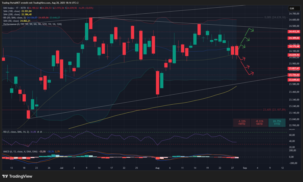 Der DAX verharrt weiter an der 24.000er-Marke und testet dabei mehrfach die 50-Tageslinie. Solange diese Zone hält, bleibt das technische Bild neutral. Ein Bruch nach unten würde allerdings Raum für eine Konsolidierung in Richtung der Augusttiefs eröffnen.
