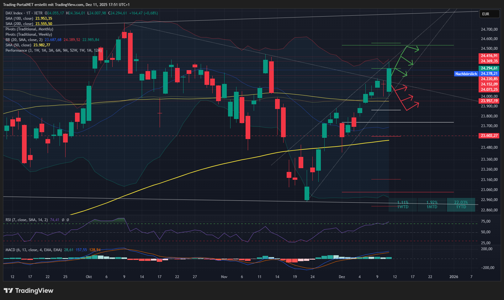 Der Dow Jones markierte ein neues Allzeithoch, und auch der DAX rückt wieder näher an seine Hochs heran – aktuell fehlen nur rund zwei Prozent. Insgesamt typische Bewegungen für den Dezember, in dem die zweite Monatshälfte traditionell fester tendiert. Mit ihr beginnt nun auch die klassische Santa-Claus-Rally-Phase, die sich statistisch bis in die erste Januarwoche erstreckt.