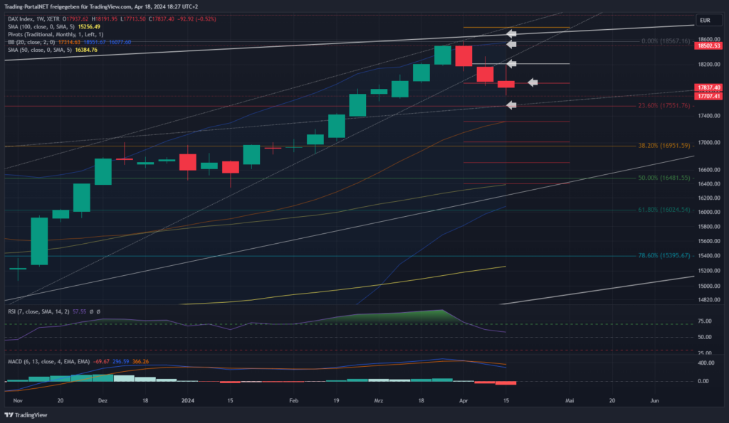 Die geopolitische Lage bleibt angespannt, insbesondere die Unsicherheit darüber, ob Israel auf die jüngsten Drohnenangriffe des Iran mit einem Gegenangriff reagieren wird. Dieser Faktor bleibt ein wesentlicher Unsicherheitsfaktor und könnte die Märkte weiterhin beeinflussen. Die Wall Street hat nun knapp 5% von ihren Höchstständen verloren, und eine mögliche Gegenbewegung könnte den konsolidierenden Charakter der aktuellen Marktbewegung betonen. Sollte sich der Abverkauf jedoch in den Wochenschluss fortsetzen, würde dies ein stärkeres Warnsignal für die Märkte darstellen und könnte darauf hinweisen, dass größere Verluste bevorstehen.