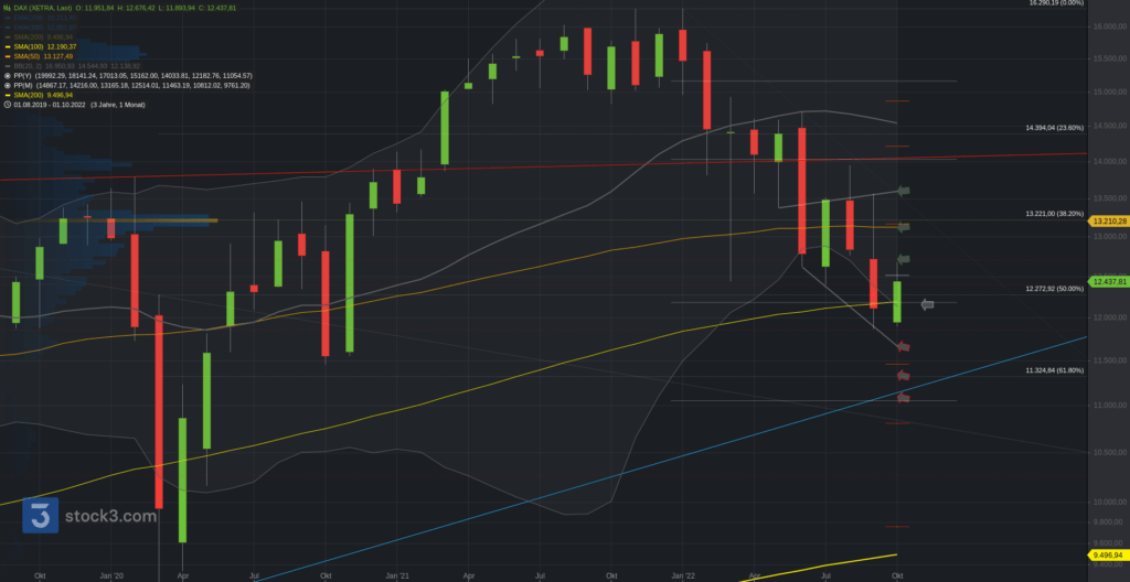 Der Blick zum DAX Monatschart, wo der DAX auf Monatsschluss September unter den Kombisupport an der 12.180. Oberhalb wäre die Spanne zur 12.400 und .700 wieder aktiv, welche zum Monatsauftakt direkt durchlaufen werden konnte. Bei Bruch Aufhellung zur 13.100. Unterhalb sei hingegen die 11.850 zur .670 aktiv. Darunter 11.450 und 11.300. Bei Bruch 11.050.