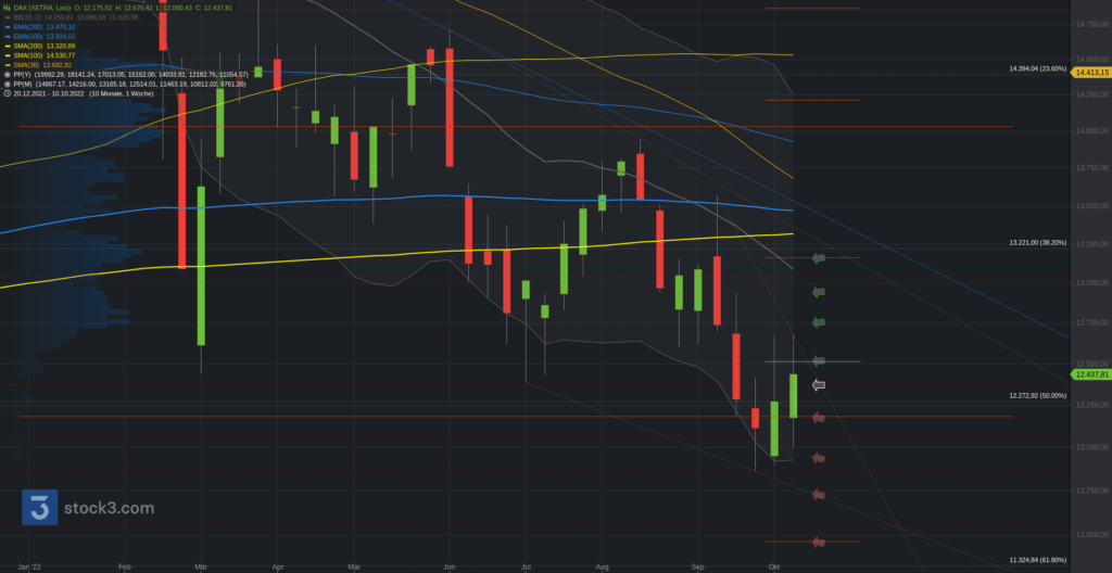 Der Blick zum Wochenchart, wo der DAX eine volatile Wochenkerze innerhalb der Vorwochenkerze zurücklässt. Nervöses Markttreiben. Die 12.370 stellen einen ersten relevanten Bereich.
