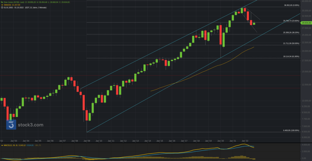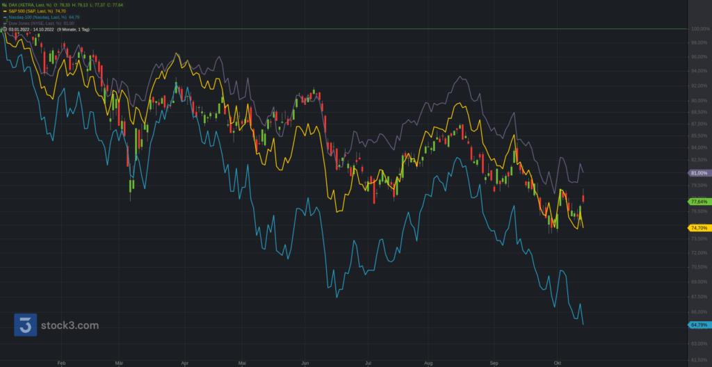 Wir beginnen die Chartreihe mit einem Performancevergleich zwischen Nasdaq100 (blau), S&P500 (gelb), Dow Jones (lila) und DAX seit Jahresbeginn. Vor allem Wachstumstitel Nasdaq100 (-34,49%) sind besonders stark unter Druck geraten. DAX (-21,70%), S&P500 (-24,82%) und Dow Jones (-18,45%) folgen mit etwas Abstand.