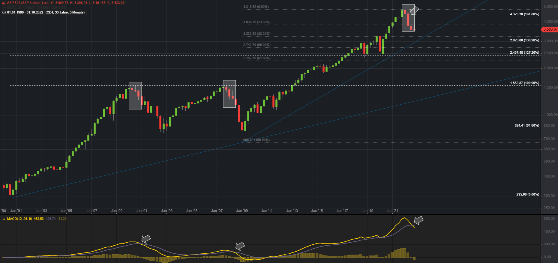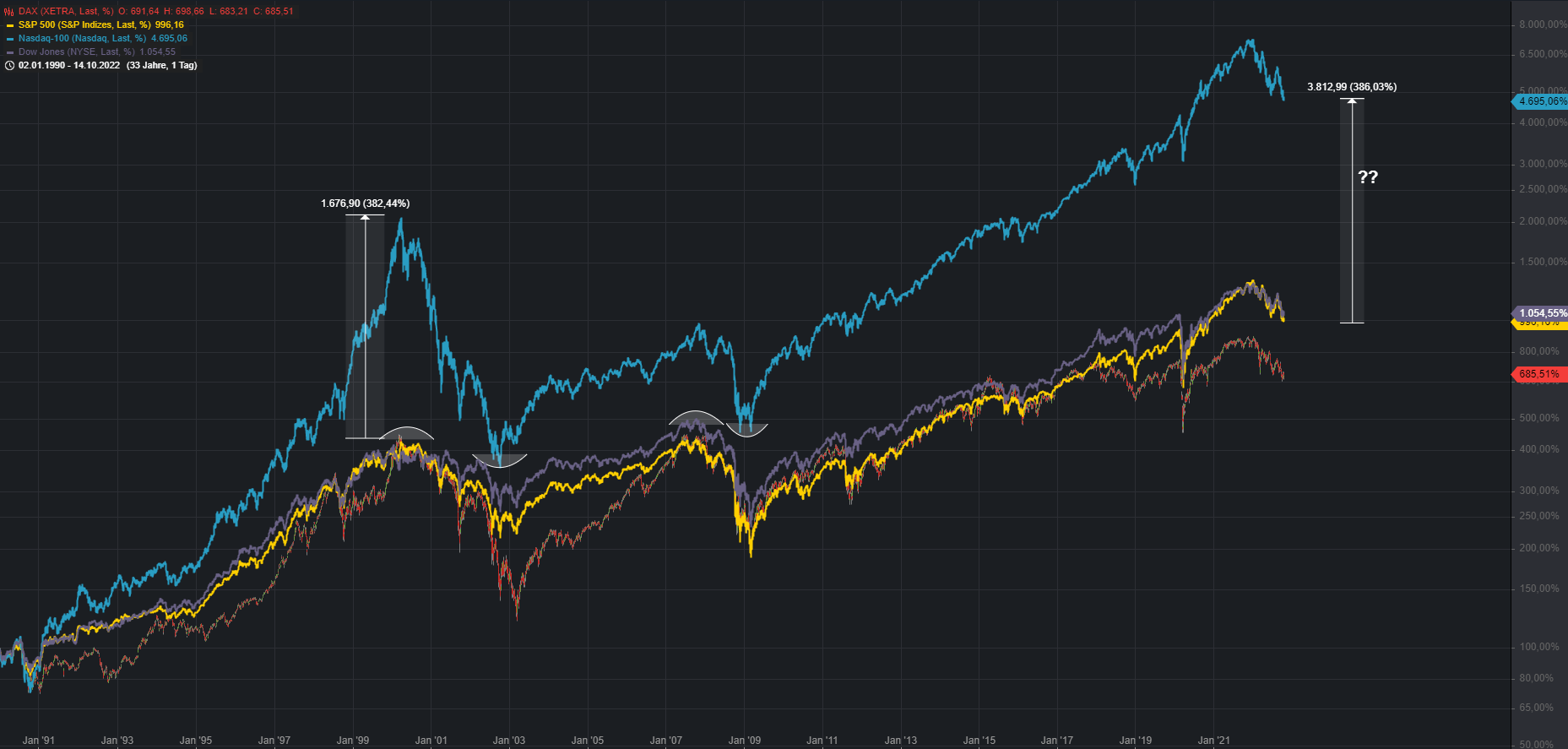 Unterhalb der 12.180 droht eine weitere Abverkaufswelle Richtung 11k. Markiert sind im Chart auch die letzten beiden großen Bärenmärkte. Sehr auffällig ist hierbei der Faktor Zeit. Die vorangegangenen Rezessionen beschäftigten den Aktienmarkt viele Jahre, bis das Vorkrisenniveau wieder erreicht werden konnte.