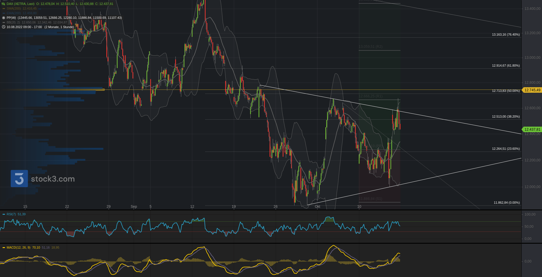 Der Blick zum Wochenchart, wo der DAX eine volatile Wochenkerze innerhalb der Vorwochenkerze zurücklässt. Nervöses Markttreiben. Die 12.370 stellen einen ersten relevanten Bereich.
