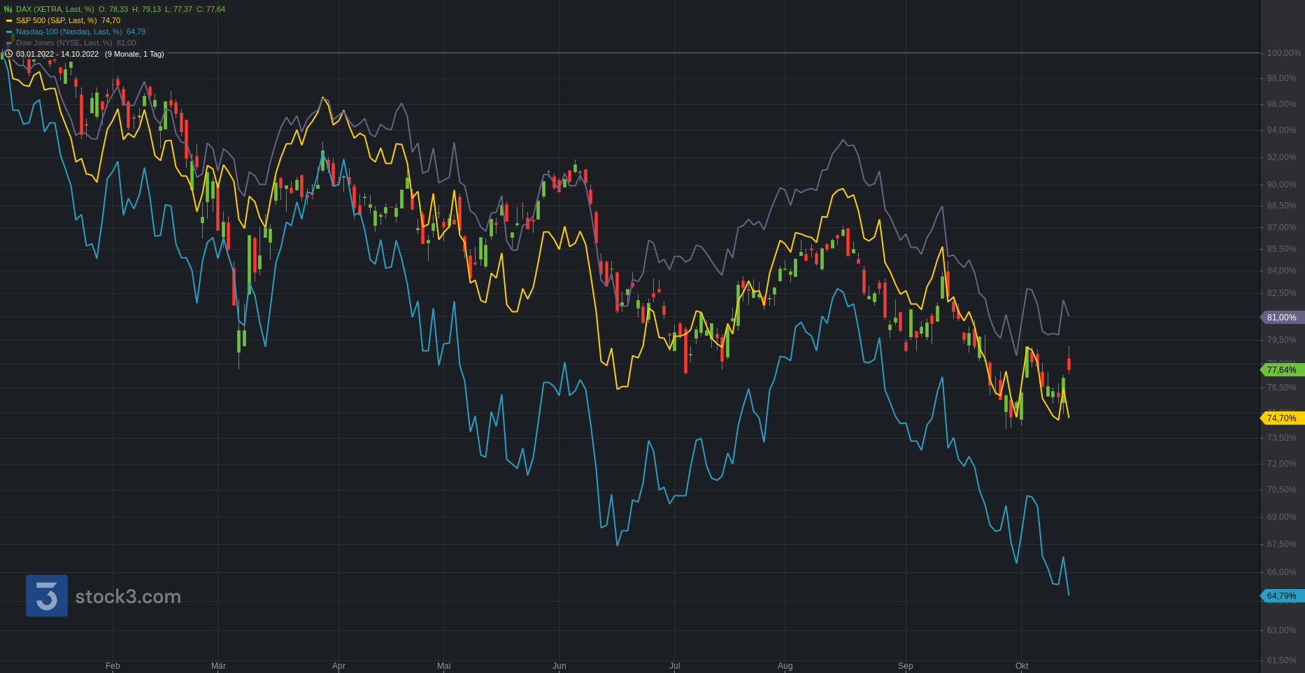 Wir beginnen die Chartreihe mit einem Performancevergleich zwischen Nasdaq100 (blau), S&P500 (gelb), Dow Jones (lila) und DAX seit Jahresbeginn. Vor allem Wachstumstitel Nasdaq100 (-34,49%) sind besonders stark unter Druck geraten. DAX (-21,70%), S&P500 (-24,82%) und Dow Jones (-18,45%) folgen mit etwas Abstand.