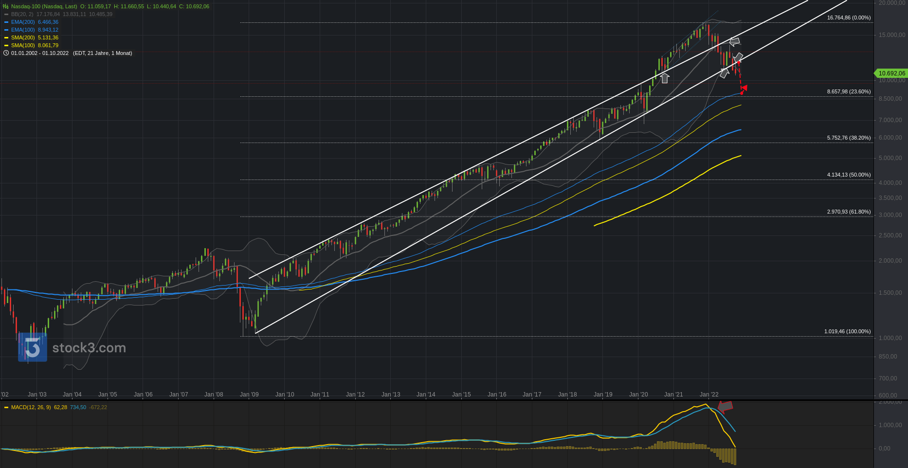 Den gleichen Zeitraum auch nochmal als Tageschart, wo die 22-jährige Keilformation während der Pandemie erst auf der Unterseite und nun auf der Oberseite verletzt wurde. Der Ukrainekrieg sorgte für ein bärisches Fehlausbruchszenario. Unterhalb der 15.1 bleibt die Keilformation somit aktiv. Die Unterkante verläuft momentan bei 11k, welche bei nachhaltigem Bruch durch die 12.2 in den Fokus rücken würde.