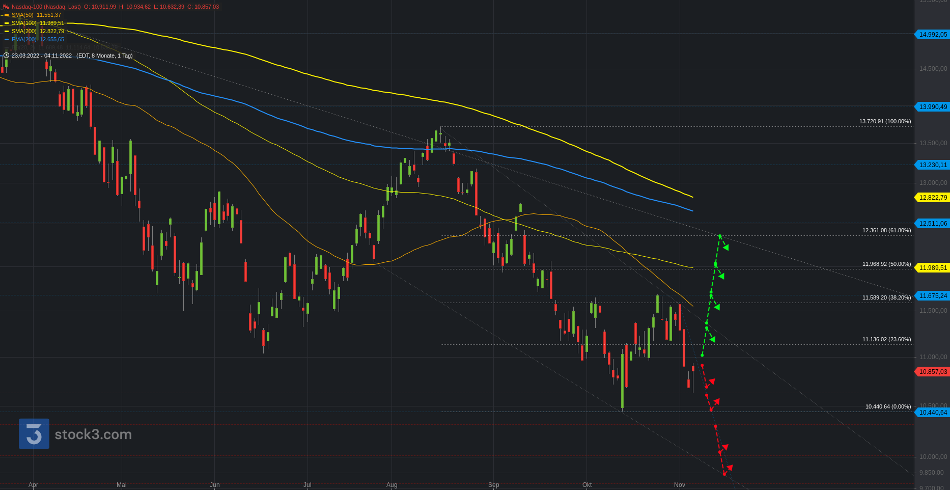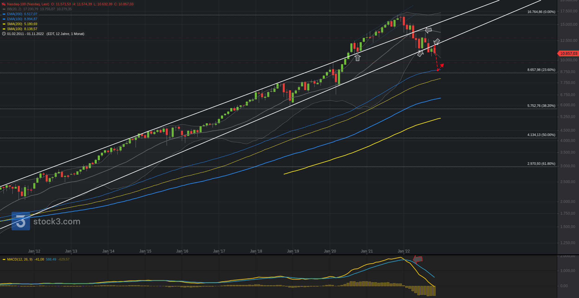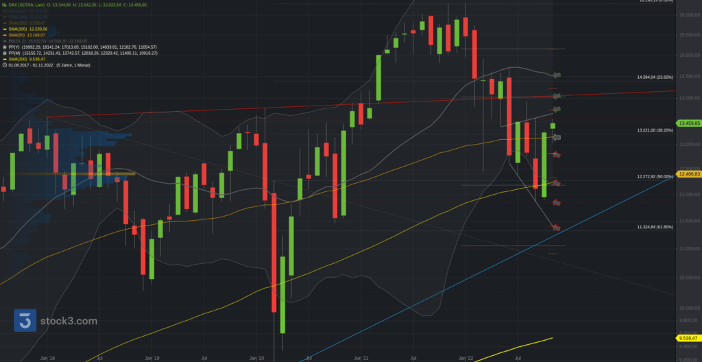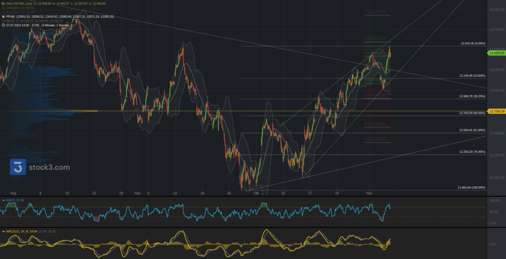 Unterhalb steht hingegen die Spanne zur 13.250. Darunter die 13.140 zur 13.080. Nach dem m. Bollinger bei 12.980 folgt der Türöffner zur 12.820.