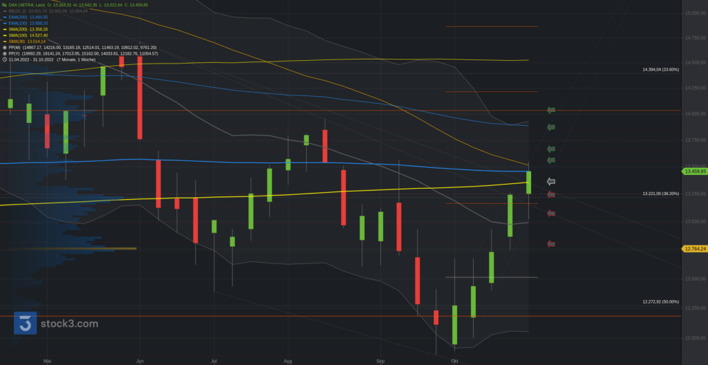 Der Blick zum Wochenchart, wo der DAX als Outperformer fünf Wochen in Folge ansteigen konnte. Abwärtstrend überwunden. Die 13.360 stellen hier einen ersten relevanten Bereich.