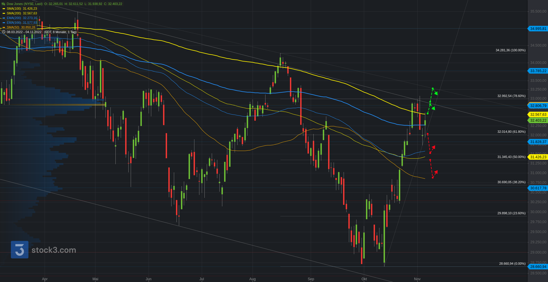 Der Blick zum Dow Jones, wo der Index über 14% im Oktober zulegen konnte. Beste Performance seit über 80 Jahren. Die 200-Tagelinie konnte hingegen nicht nachhaltig überwunden werden. Die Bullen brauchen diese Zone, um die Rally weiter zu befeuern, andernfalls droht die Korrektur. Die 32k stellt den ersten relevanten Bereich. Oberhalb können die Bullen eine Spanne zum sma200 bei 32.600 halten. Darüber 32.800 und 33.300. Bei Bruch weitere Aufhellung. Unterhalb stellen hingegen die 100-Tagelinien bei 31.400 eine nächste Unterstützung. Bei Bruch 30.800. In der zweiten Grafik ist das übergeordnete Bild im Dow Jones Quartalschart zu erkennen.