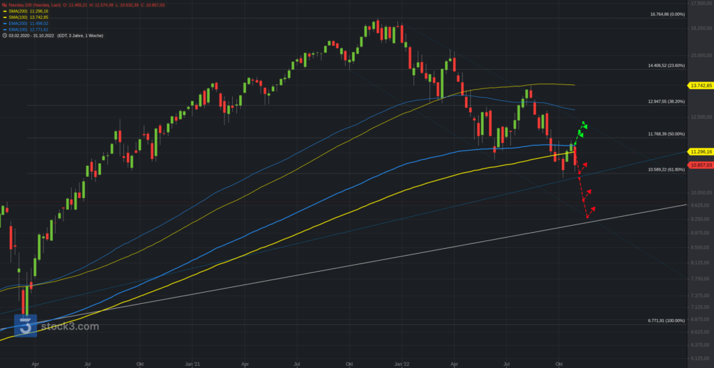 Der Nasdaq100 als diesjähriger Underperformer konnte von der Bärenmarktrally gar nicht profitieren. Die kleine iSKS-Formation konnte nicht aufgegriffen werden. Nun braucht es den Doppelboden am Jahrestief, um den Rutsch in die 4-stelligkeit zu vermeiden. Die 11k stellt einen ersten relevanten Bereich. Oberhalb bleibt die Spanne 11.3 zur 11.6 aktiv. Darüber erste leichte Aufhellung Richtung 12k. Bei Bruch 12.350. Unterhalb rückt nach der 10.6 das Jahrestief 10.440 in den Fokus. Bei Bruch Türöffner 10.3 zur 10k. Das Stagflations- und geldpolitische Szenario bleibt ein schwieriges Umfeld für „Growth“.