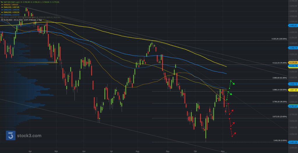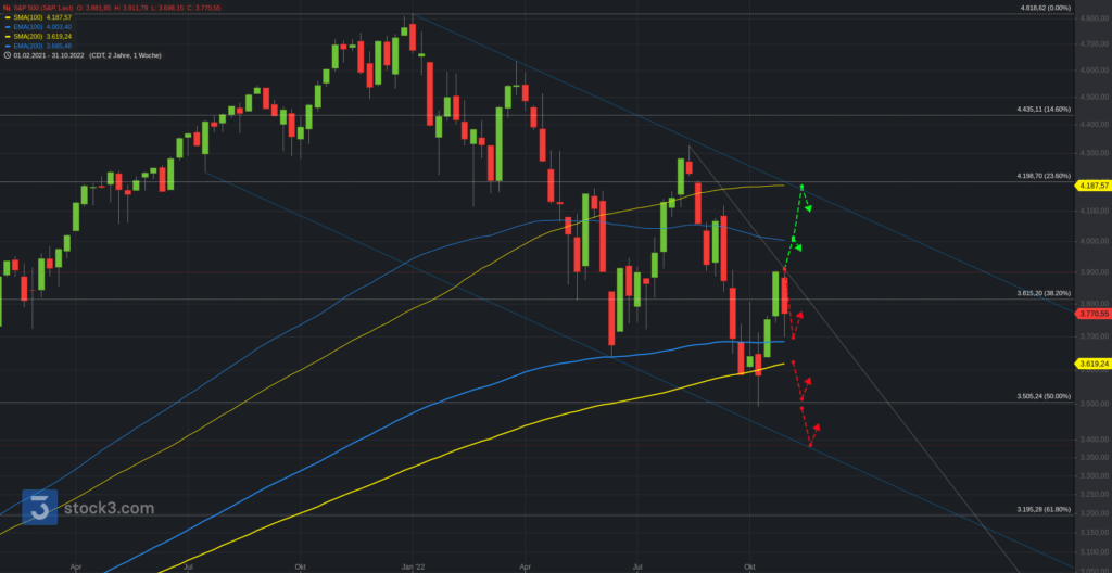 Ein kurzer Blick in den US-Markt (Komplette Updates für den US-Markt gibt es auf Trading-Portal.NET – Premium) ins übergeordnete Bild. Der S&P500 prallte in der vergangenen Woche an seinen 100-Tagelinien bei 3.900 deutlich ab. Die Bullen brauchen diese Marke, um die Rally weiter zu befeuern. Oberhalb der 3.800 bleibt die Spanne zur 3.900 weiter aktiv. Darüber Aufhellung und Fortsetzung der Rally zur 3.985 und 4.030 (ema200). Unterhalb bleiben hingegen die 3.680 und anschließend 3.600 im Blick. Darunter brauchen die Bullen den Umweg über das Jahrestief (Doppelboden?).