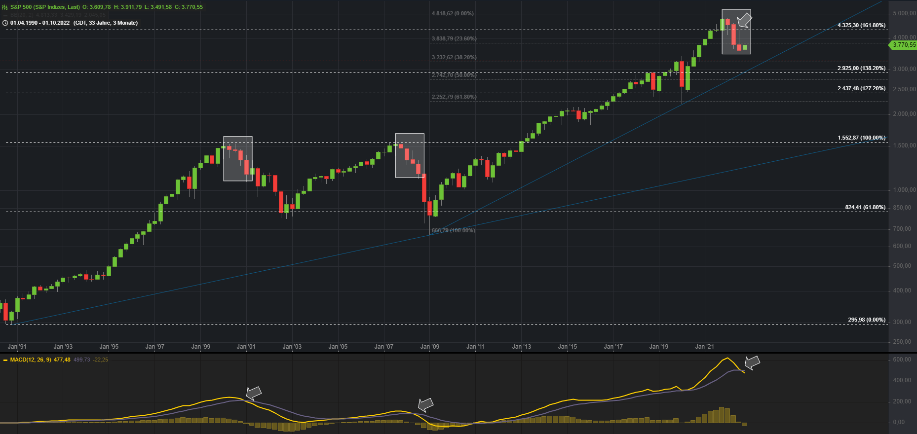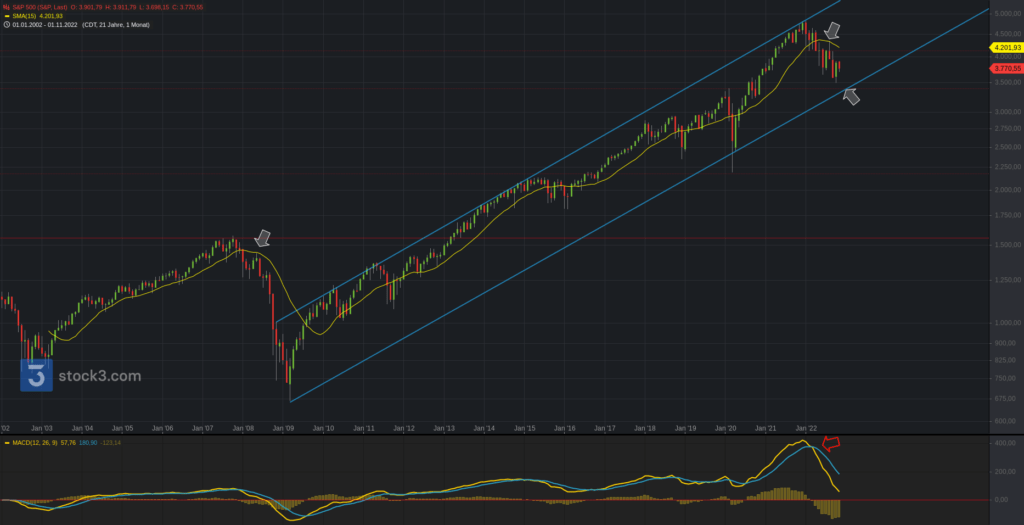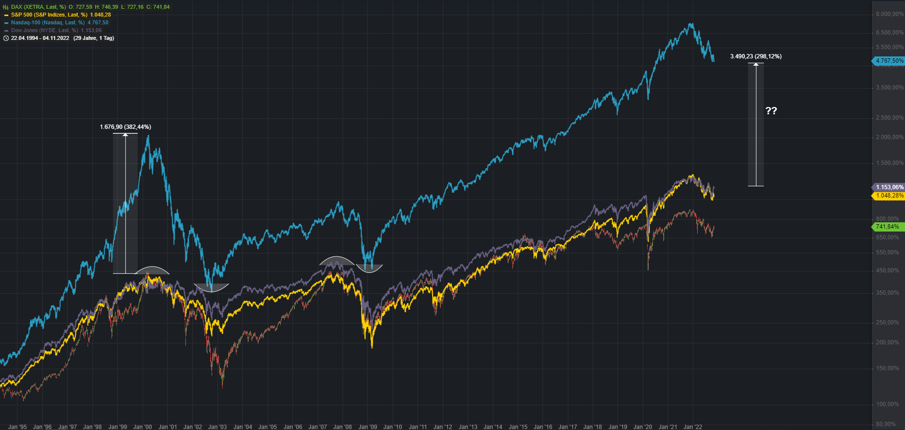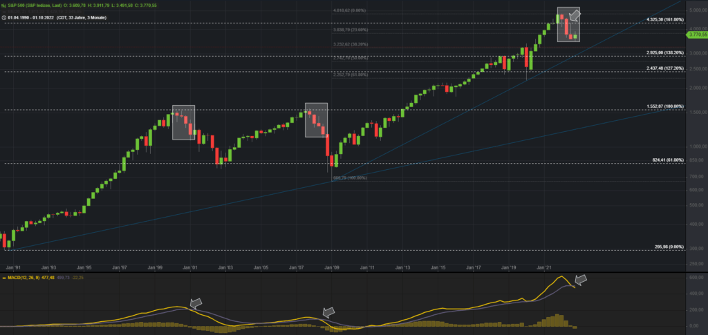 Unterhalb der 12.180 droht eine weitere Abverkaufswelle Richtung 11k. Markiert sind im Chart auch die letzten beiden großen Bärenmärkte. Sehr auffällig ist hierbei der Faktor Zeit. Die vorangegangenen Rezessionen beschäftigten den Aktienmarkt viele Jahre, bis das Vorkrisenniveau wieder erreicht werden konnte.