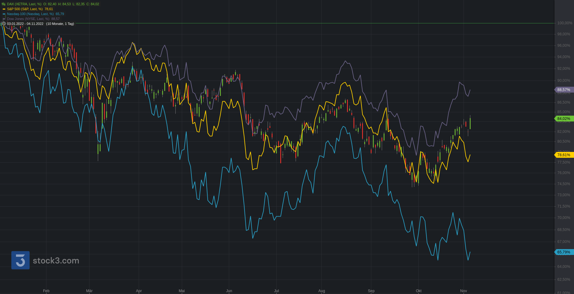 Wir beginnen die Chartreihe mit einem Performancevergleich zwischen Nasdaq100 (blau), S&P500 (gelb), Dow Jones (lila) und DAX seit Jahresbeginn. Vor allem Wachstumstitel Nasdaq100 (-33,47%) sind besonders stark unter Druck geraten. DAX (-15,27%), S&P500 (-20,89%) und Dow Jones (-10,83%) folgen mit etwas Abstand.
