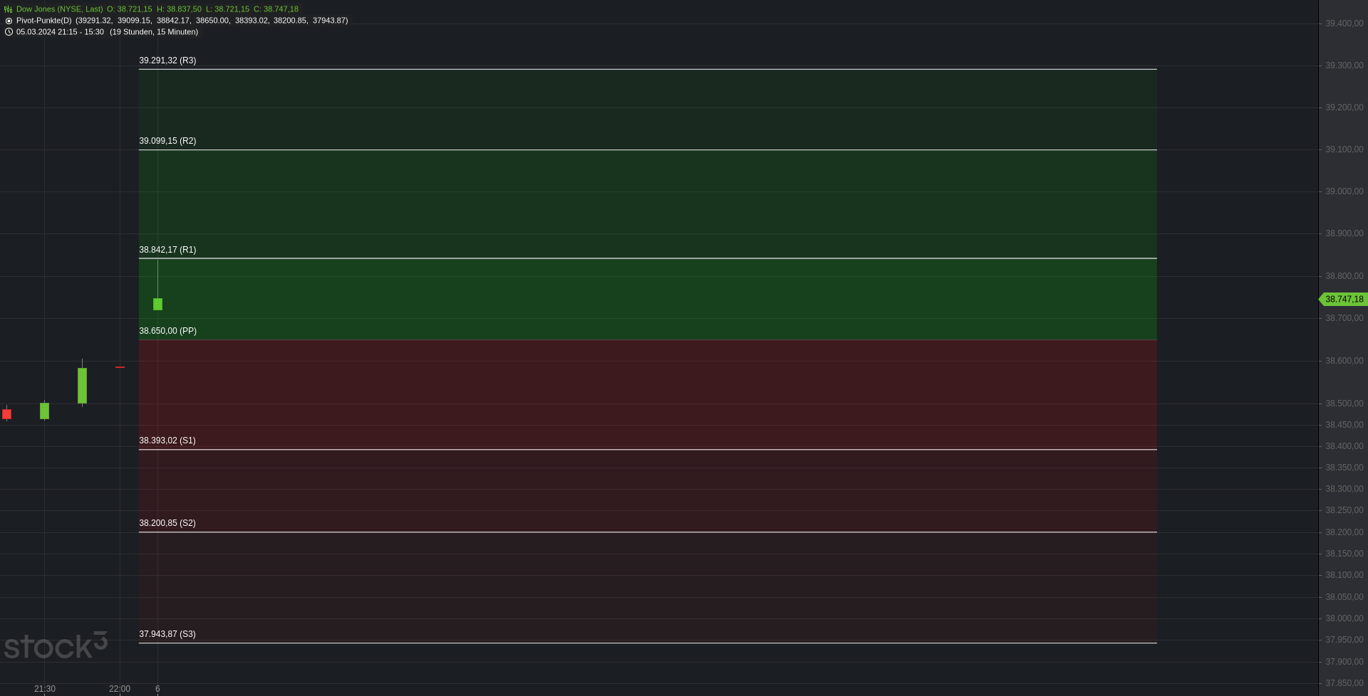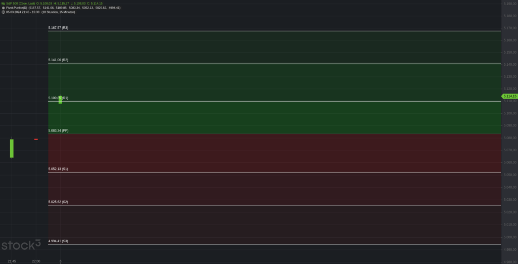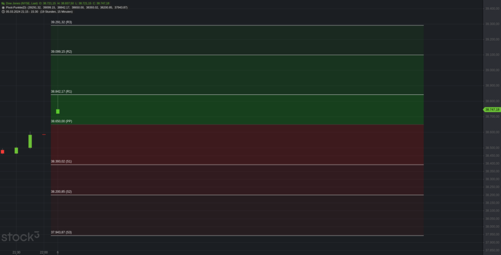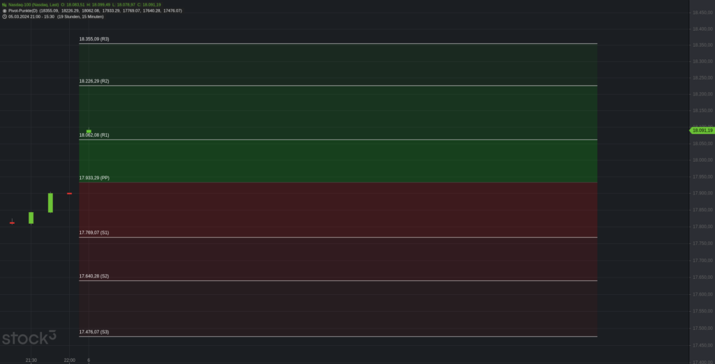 Die Pivot-Punkte dienen als technische Analysewerkzeuge für Händler, um potenzielle Unterstützungs- und Widerstandsniveaus für die jeweiligen Indizes zu identifizieren. Sie werden täglich berechnet und können für kurzfristige Handelsentscheidungen nützlich sein. Pivot-Punkte werden anhand der Hoch-, Tief- und Schlusskurse des Vortages berechnet und dienen dazu, mögliche Wendepunkte für die Kursbewegungen der Indizes zu prognostizieren. Wenn der Kurs eines Index über dem Pivot-Punkt liegt, kann dies als ein bullisches Signal interpretiert werden, das auf eine mögliche Fortsetzung des Aufwärtstrends hindeutet. Liegt der Kurs hingegen unter dem Pivot-Punkt, deutet dies auf eine mögliche Umkehr des Abwärtstrends hin.