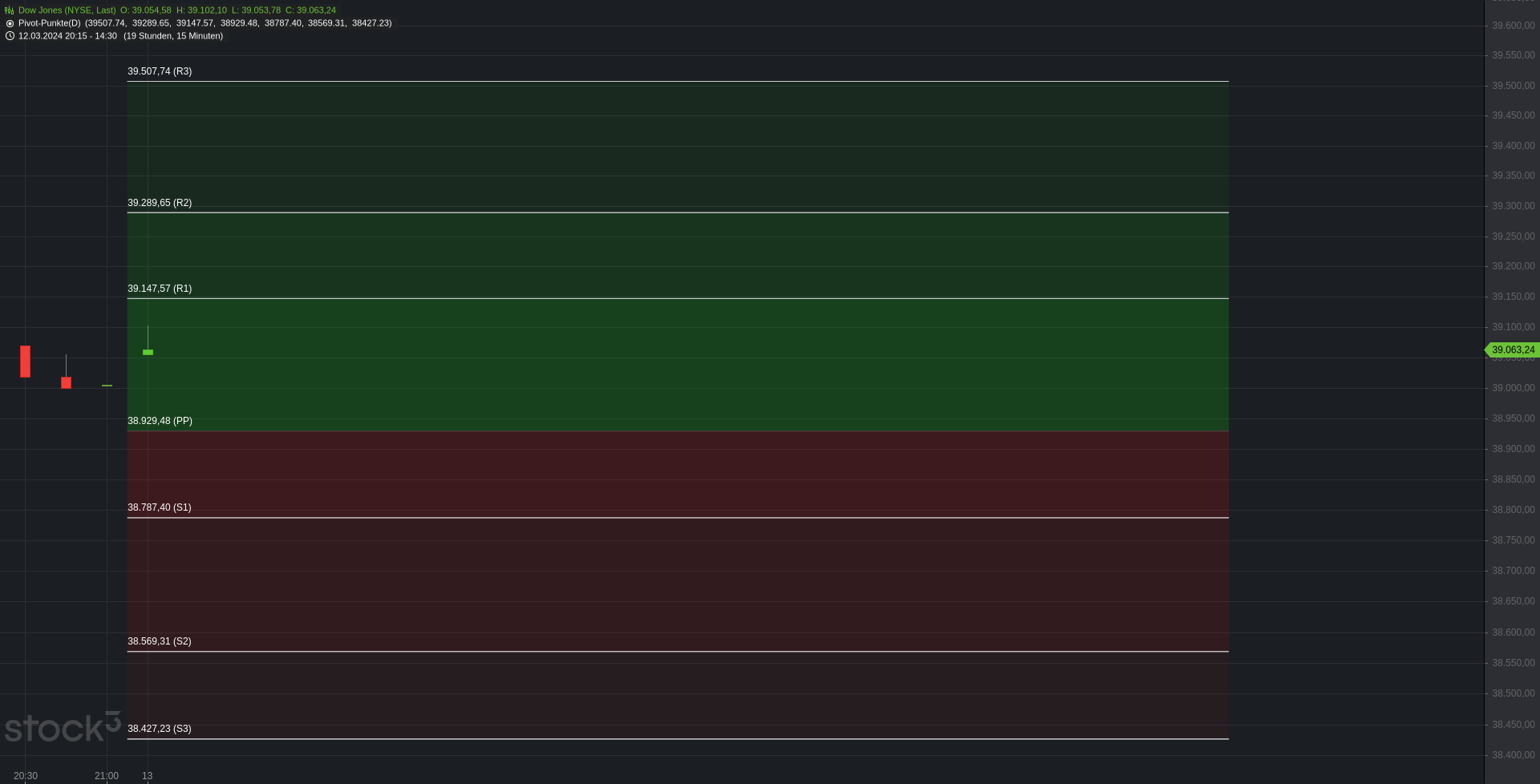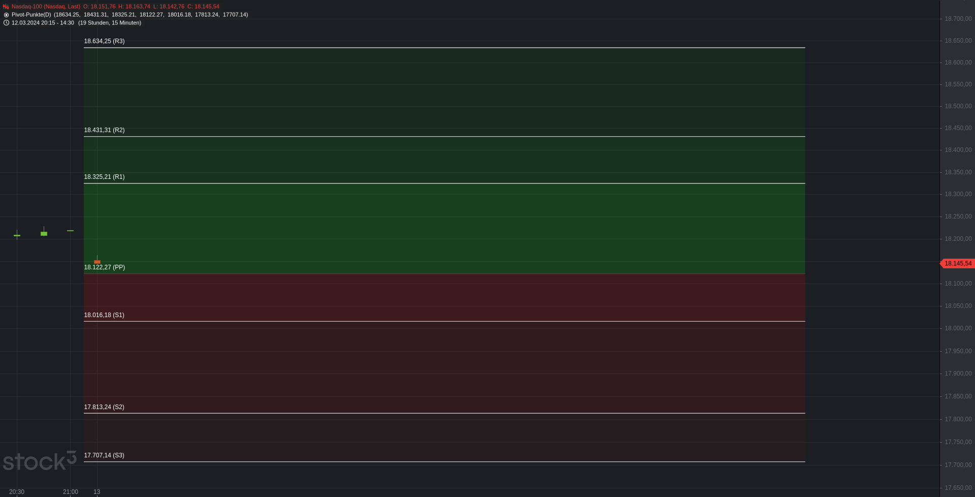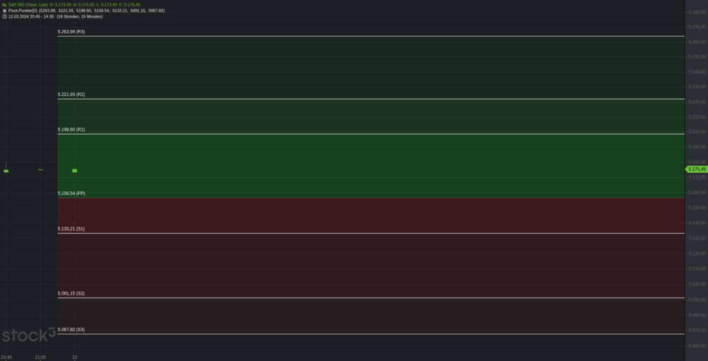 Die Pivot-Punkte dienen als technische Analysewerkzeuge für Händler, um potenzielle Unterstützungs- und Widerstandsniveaus für die jeweiligen Indizes zu identifizieren. Sie werden täglich berechnet und können für kurzfristige Handelsentscheidungen nützlich sein. Pivot-Punkte werden anhand der Hoch-, Tief- und Schlusskurse des Vortages berechnet und dienen dazu, mögliche Wendepunkte für die Kursbewegungen der Indizes zu prognostizieren. Wenn der Kurs eines Index über dem Pivot-Punkt liegt, kann dies als ein bullisches Signal interpretiert werden, das auf eine mögliche Fortsetzung des Aufwärtstrends hindeutet. Liegt der Kurs hingegen unter dem Pivot-Punkt, deutet dies auf eine mögliche Umkehr des Abwärtstrends hin.