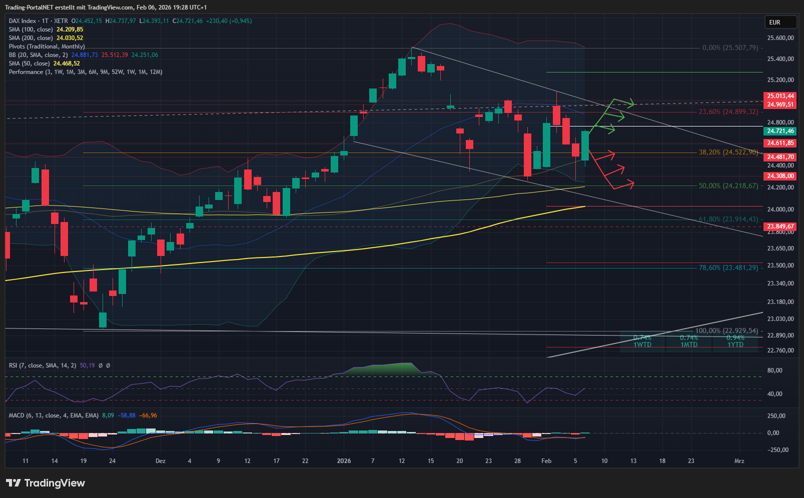 Ein positiver Abschluss einer sehr volatilen und besonderen Handelswoche. Der Test zentraler Unterstützungszonen konnte bis in den Wochenschluss hinein erneut verteidigt werden. Damit bleibt – trotz zahlreicher Unsicherheitsfaktoren – die neutrale Range weiterhin aktiv. Der DAX schloss die Woche sogar mit einem soliden Plus.