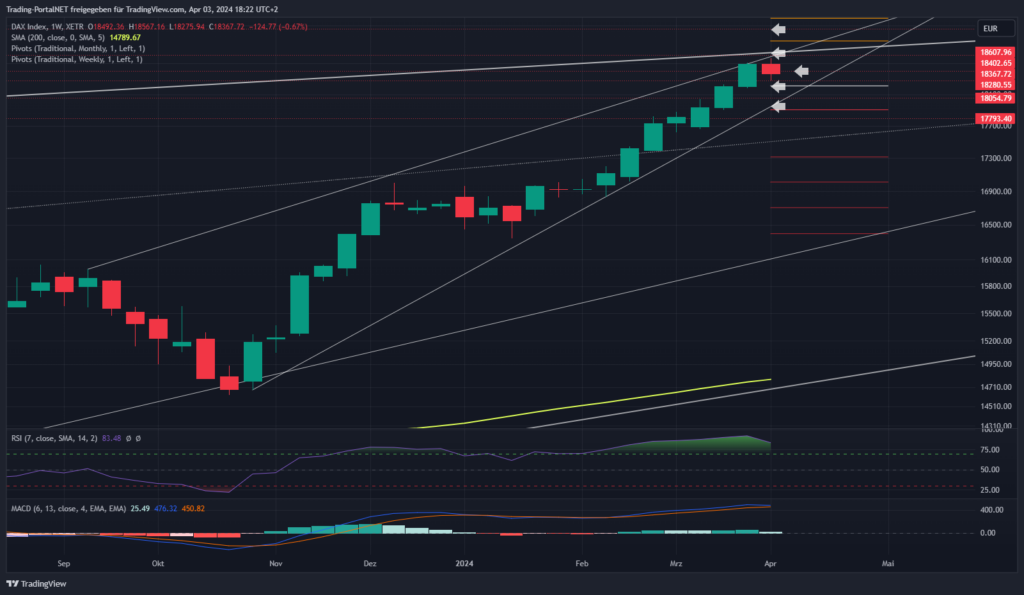 Der Blick auf den Wochenchart, wo der DAX den Herbstanstieg Mitte Januar nur bis zum 23,6-er Fibu-Level konsolidierte und anschließend die nächste Impulsbewegung starten konnte. Umkehrsignale sind bisher nicht vorhanden. Eine 1 zu 1 Projektion der Herbstbewegung könnte gar die 19k noch in den Fokus rücken. Eine Zwischenkonsolidierung in Form einer 4. Welle wäre zuvor noch zu erwarten. Die erste neutrale Wochenrange verläuft von 18.4 zur 18.600/.650. Oberhalb 18.800. Unterhalb wäre die Spanne zur 18.280/.210 zu nennen. Anschließend folgen 18.050/17.950.