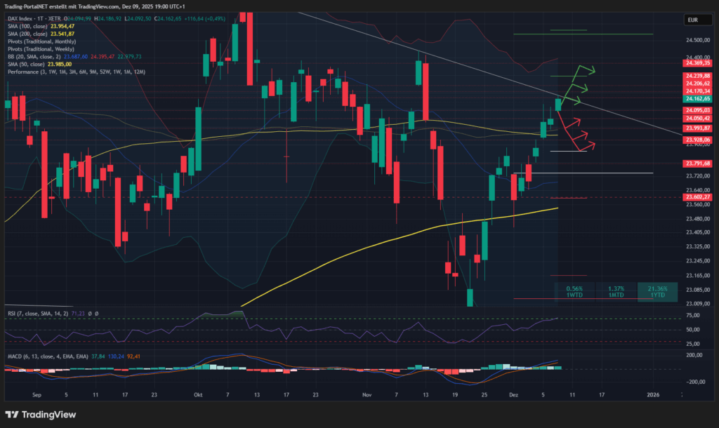Der DAX konnte seine Rolle als Outperformer dagegen nochmals bestätigen: Im Kassa-Handel testete er den Oktober-Abwärtstrend bei 24.200 Punkten und hat seit dem Novembertief vor zwei Wochen rund +5,5 % zugelegt. Spannend wird sein, ob sich diese relative Stärke nach der Fed-Entscheidung hält – oder ob sie in eine Gegenbewegung umschlägt. Mit einer Jahresperformance von über 21 % liegt der DAX immerhin fast gleichauf mit dem Nasdaq 100.