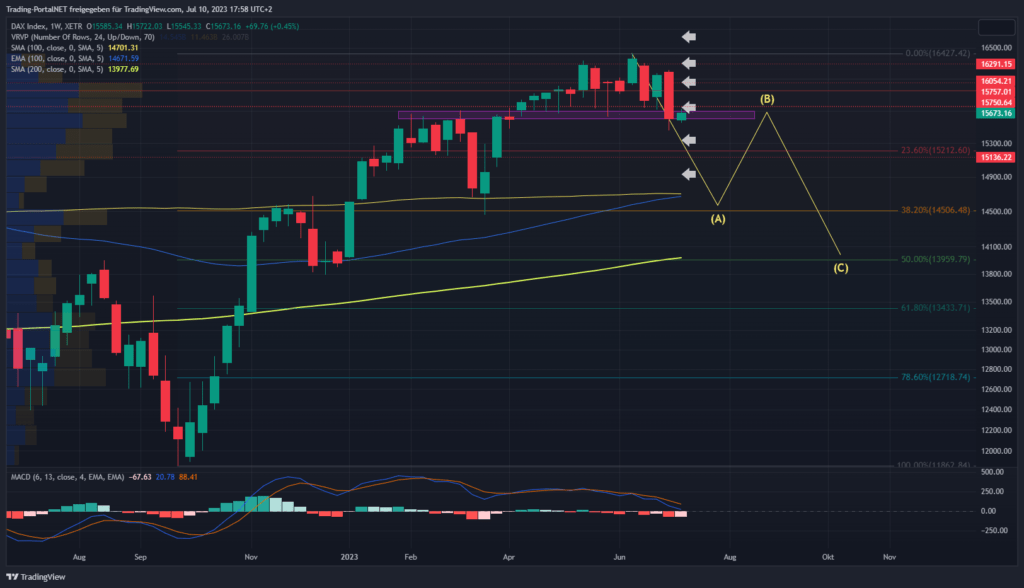 Der Blick zum Wochenchart, wo der DAX die wichtige Supportzone an der 15.7/15.6 erstmals auf Wochenschlussbasis verletzte. Die Bullen brauchen den Rücklauf in die alte Range, ansonsten dürfte die Saisonalität in den nächsten Wochen für allgemeine Kursschwäche sorgen. Sehr auffällig ist auch die relative Schwäche zur Wall Street. Die 15.3/15.4 stellen die nächste Supportzone. Die 15.750 stellen im Wochenchart einen ersten relevanten Bereich. Oberhalb läuft der DAX zurück in die alte Range mit Zielen bei 16.050 und anschließend .270. Unterhalb dürfte sich eine neue Spanne zur 15.350 öffnen. Bei Bruch 15.130 und anschließend 14.9.