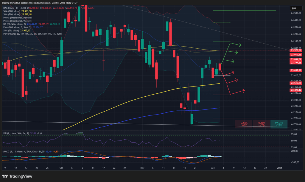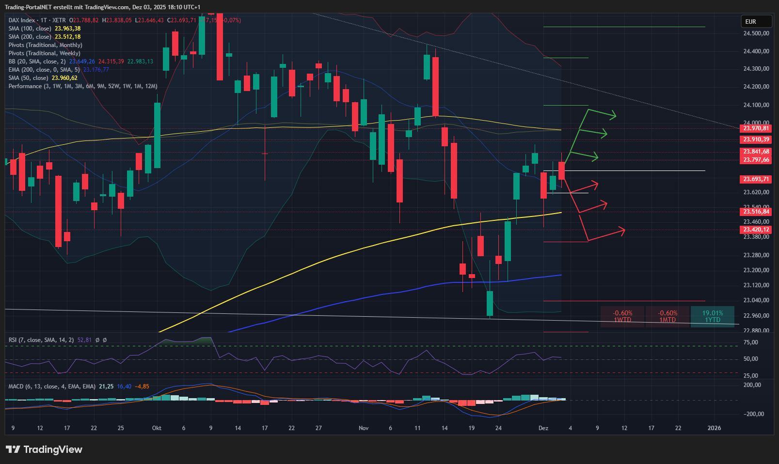 Der DAX verteidigt weiterhin seine Range zwischen der 200-Tageslinie und der Widerstandszone um 24.000 Punkte. Auch an der Wall Street bleibt das Bild unverändert: Die Indizes verharren in einer engen Spanne direkt vor ihren Allzeithochs. Eine fortgesetzte, flache Konsolidierung bleibt trotz der hohen Zurückhaltung weiterhin wahrscheinlich.