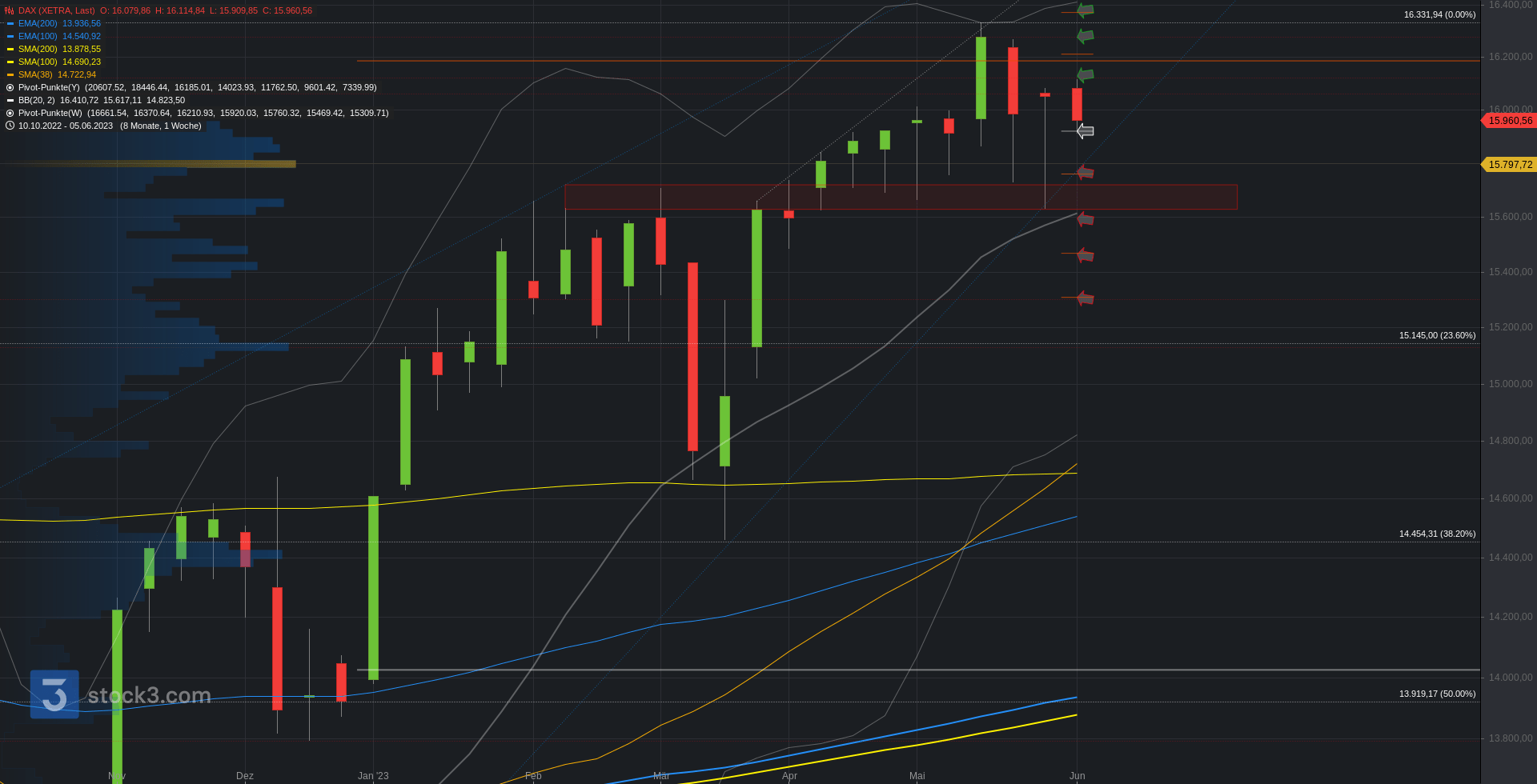 Oberhalb bleibt der Cluster über die 16.060 zur 16.120 aktiv. Darüber folgen über die 16.210 die 16.270. Anschließend ein neues AZH bei .370. Bei Bruch weitere Gewinne zur 16.500/.580 möglich.