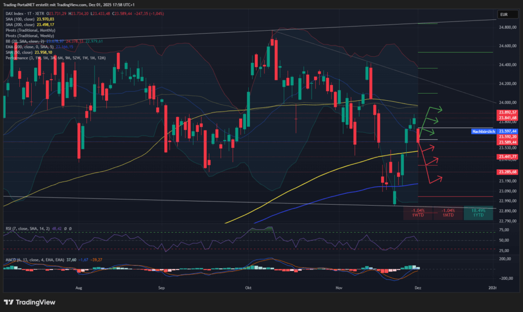 Der DAX testete erneut seine 200-Tageslinie (SMA200) und bewegt sich damit weiter mitten in seiner übergeordneten Seitwärtsrange. Für eine nachhaltige Aufhellung benötigen die Bullen einen Ausbruch über 24.000 Punkte, während die Bären auf einen Test der Novembertiefs setzen. Diese Abwärtsdynamik sollte aus bullischer Sicht jedoch unbedingt vermieden werden, da sonst eine charttechnische Eintrübung droht – und damit eine Absage an einen versöhnlichen Jahresausklang.