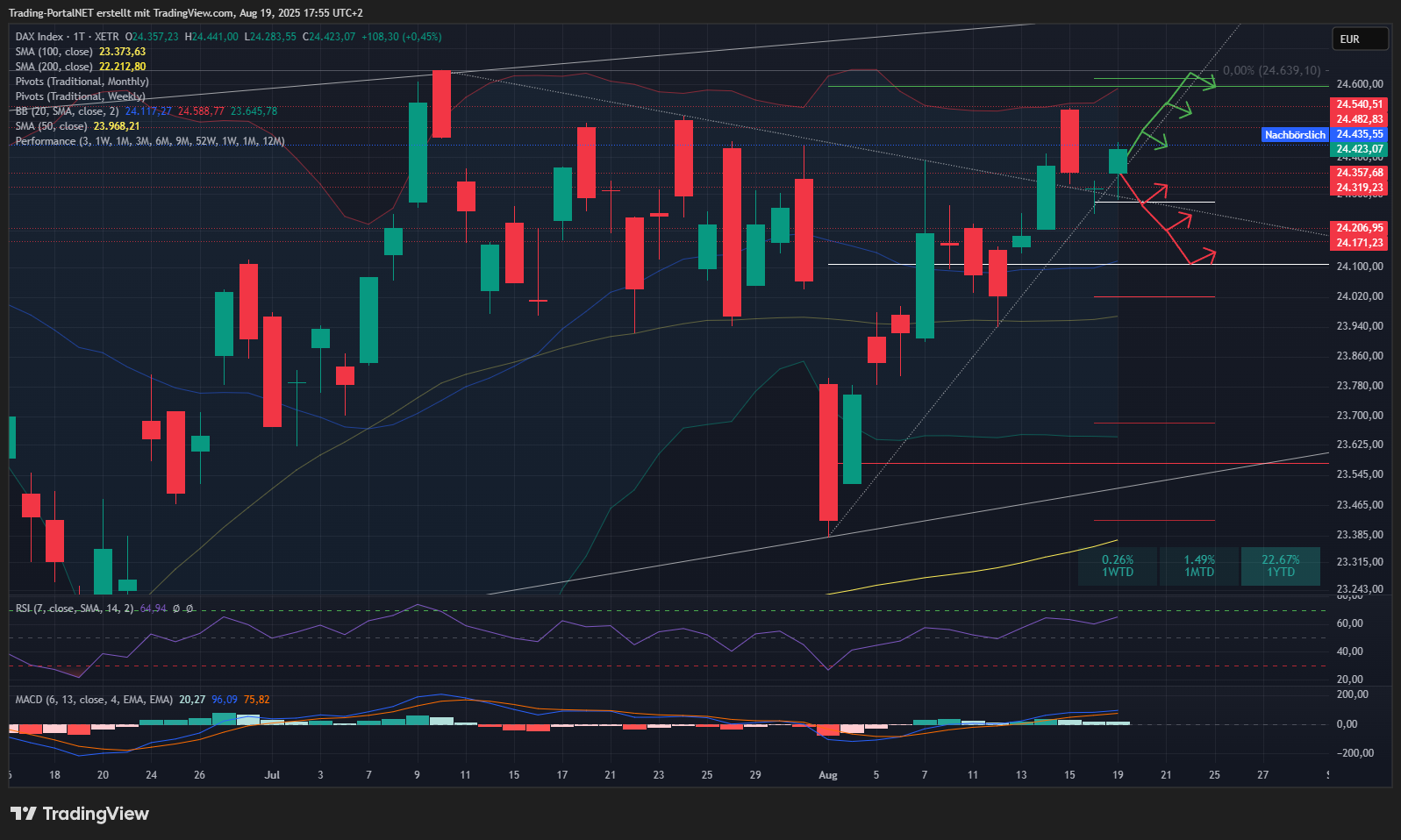 Oberhalb bleibt die Spanne über die 24.360 zum AZH an der 24.6 aktiv. Darüber rückt die 24.850 in den Fokus. Anschließend 25.130/.200.