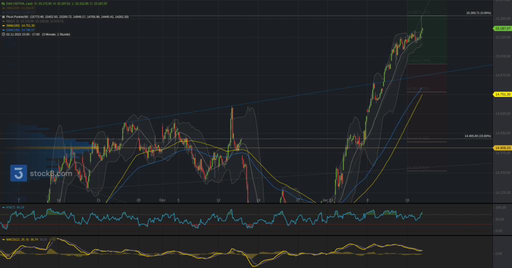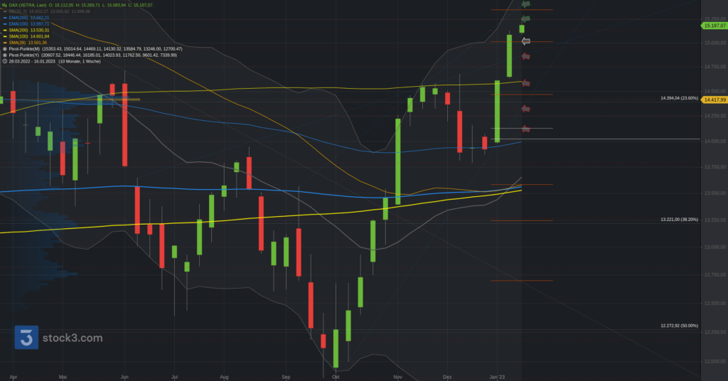 Der DAX konnte am Dienstag nach einer Schlagzeile zur EZB (eventuell nur Zinserhöhung um 25 Basispunkte im Februar) einen neuen Hochpunkt nahe der 15.3 anstreben. Der Index konnte damit seit Jahresauftakt in der Spitze über +9,5% zulegen; sein bester Jahresauftakt seit 1988! Angetrieben wird/ wurde die Bewegung durch einen Short-Squeeze und die Schieflage der Stillhalter für den Januar-Verfallstermin. Die heutige Bewegung hatte Tendenzen einer finalen Übertreibungsphase und SL-Fishing.