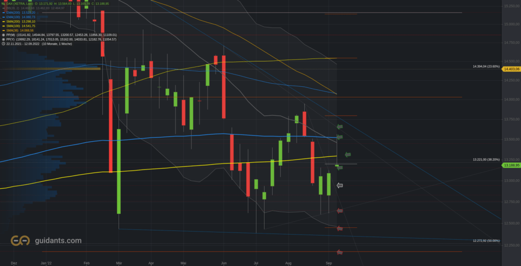 Der Blick zum Wochenchart, wo sich der DAX höchstvolatil am Jahrestief bewegt. Wochenkerze nahezu identisch mit der Vorwochenkerze. Vorsicht, Verfallsterminwoche! Die 12.940 stellen einen ersten relevanten Bereich.