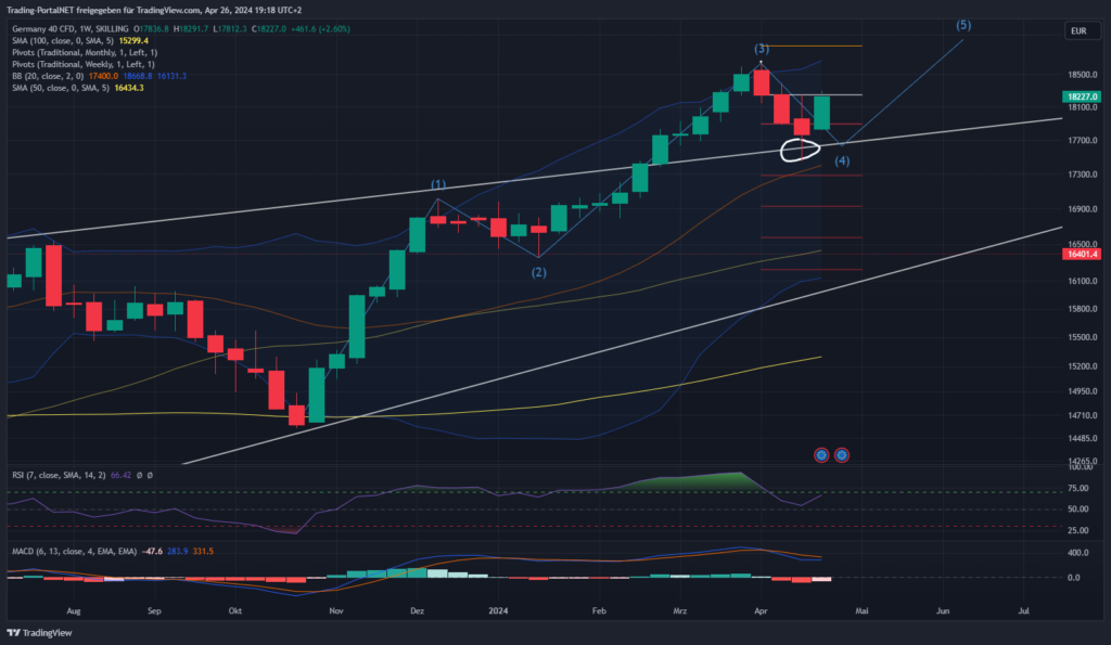 Der Blick auf den Wochenchart, wo der DAX nach 3 Verlustwochen in Folge die Gegenbewegung einleiten konnte. Bei aufkommender Dynamik über die 18.2 würde der DAX sogar noch die Chance einer 5. Welle zum neuen Allzeithoch hochhalten. Die 17.900 stellen die nächstgrößere Supportzone. Oberhalb bleibt eine neutrale Range 18.040 zur 18.200 aktiv. Darüber Chance auf Aufhellung über die .340 Richtung 18.500. Unterhalb bleibt die Abwärtsgefahr aktut mit einem Wochencluster zur 17.740 und anschließend 17.6/.550.