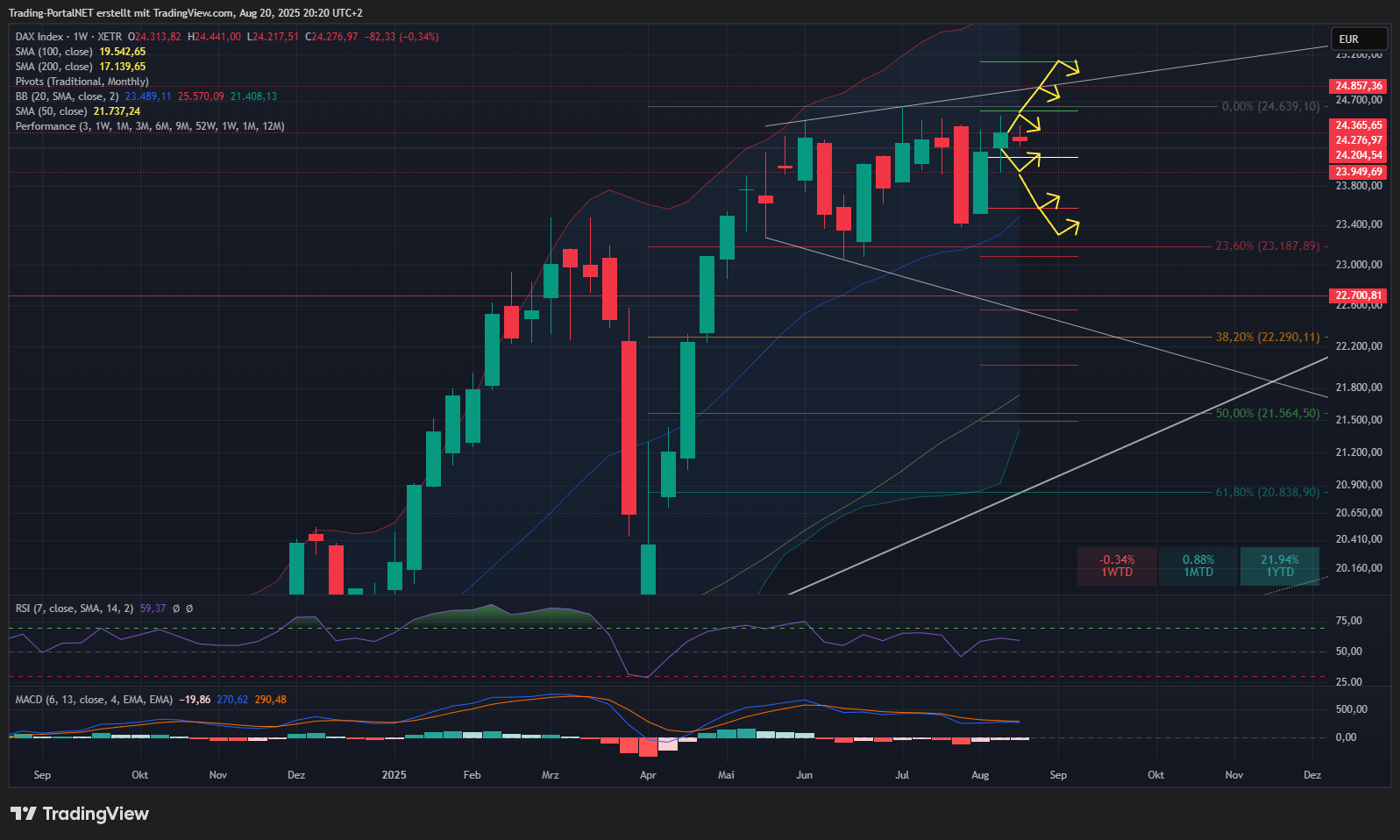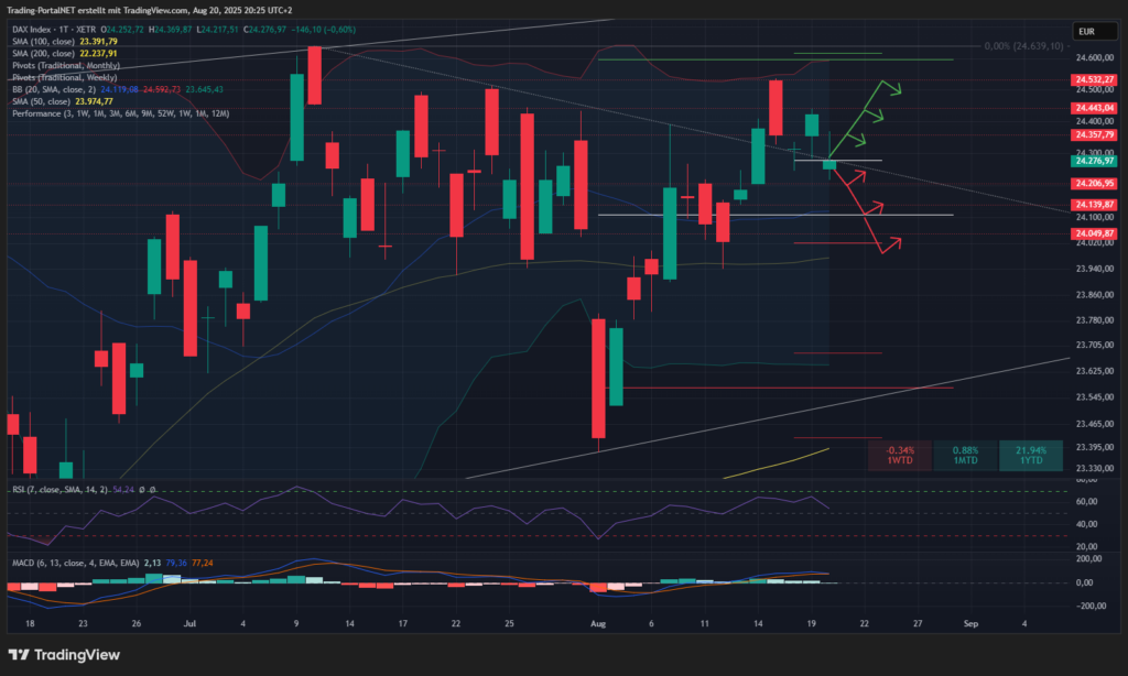 Oberhalb bleibt die Spanne über die 24.360 zum AZH an der 24.6 aktiv. Darüber rückt die 24.850 in den Fokus. Anschließend 25.130/.200.