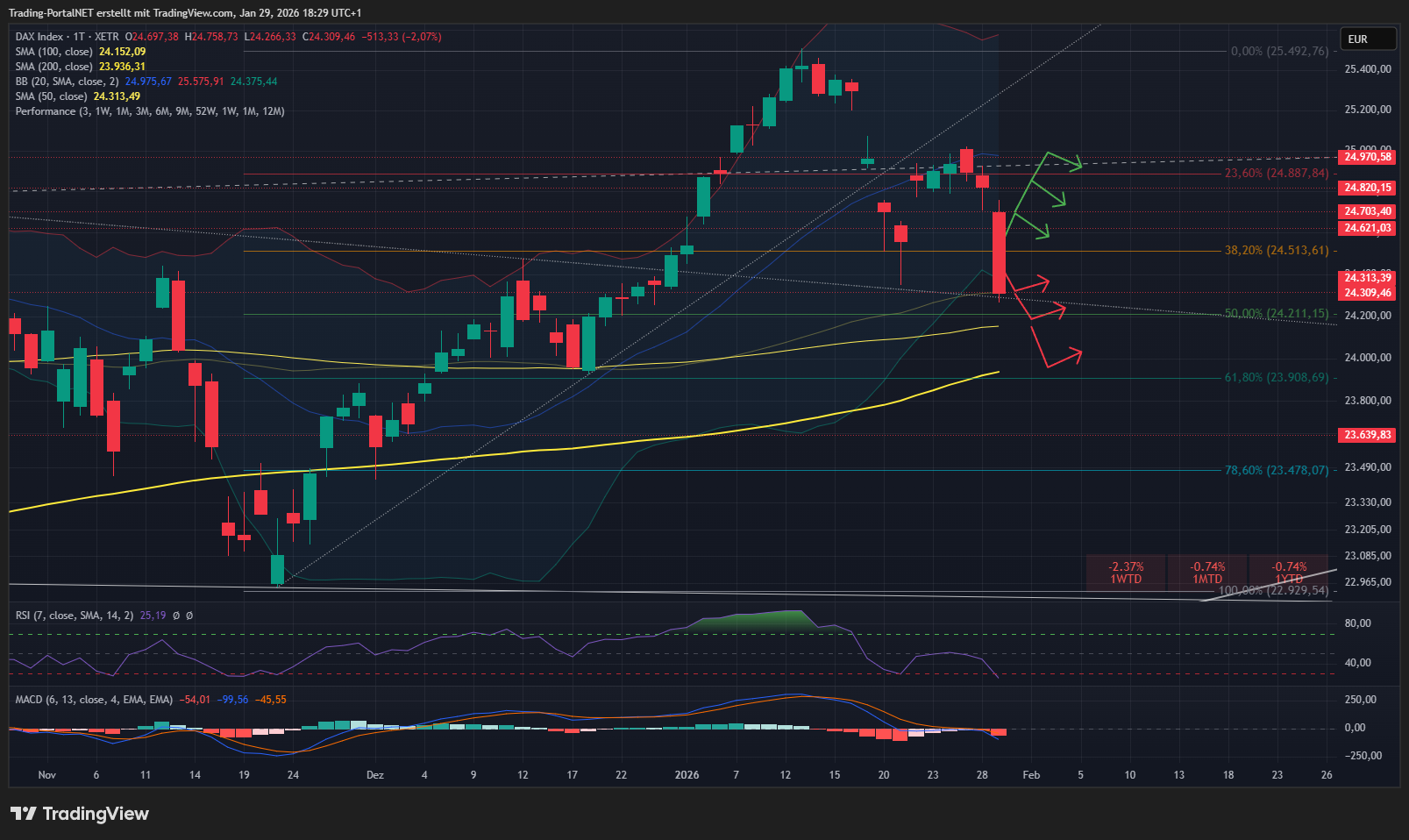 Der DAX fiel heute auf ein neues Monatstief und notiert wieder mitten in seiner Mai-Seitwärtsrange. Ein zentraler Belastungsfaktor war SAP, das den schärfsten Abverkauf seit fünf Jahren verzeichnete und nun rund 43 % unter dem Allzeithoch notiert. Für den DAX deutet sich damit eine sehr schwache Monatskerze an – keine guten Vorgaben für den Februar, der ohnehin als volatiler Monat gilt.