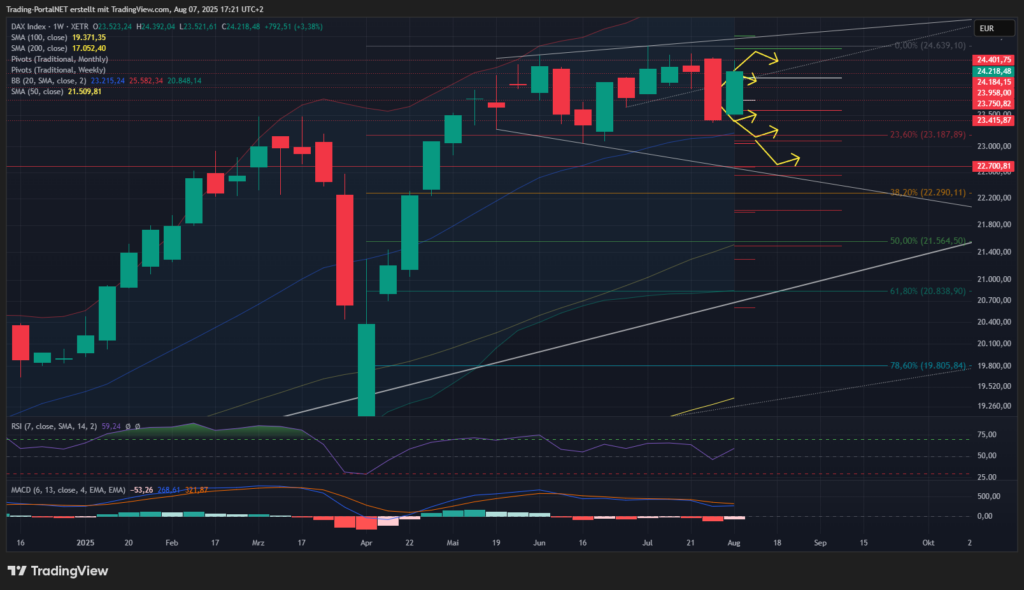 Unterhalb ist der Cluster zur 23.580 und 23.4 aktiv. Darunter droht weiterer Abgabedruck zur Kombisupportzone an der 100-TL 23.230 und 23.150 (m. B. weekly). Bei Bruch droht die nächste Eintrübung über die 23.050 zur 22.7.