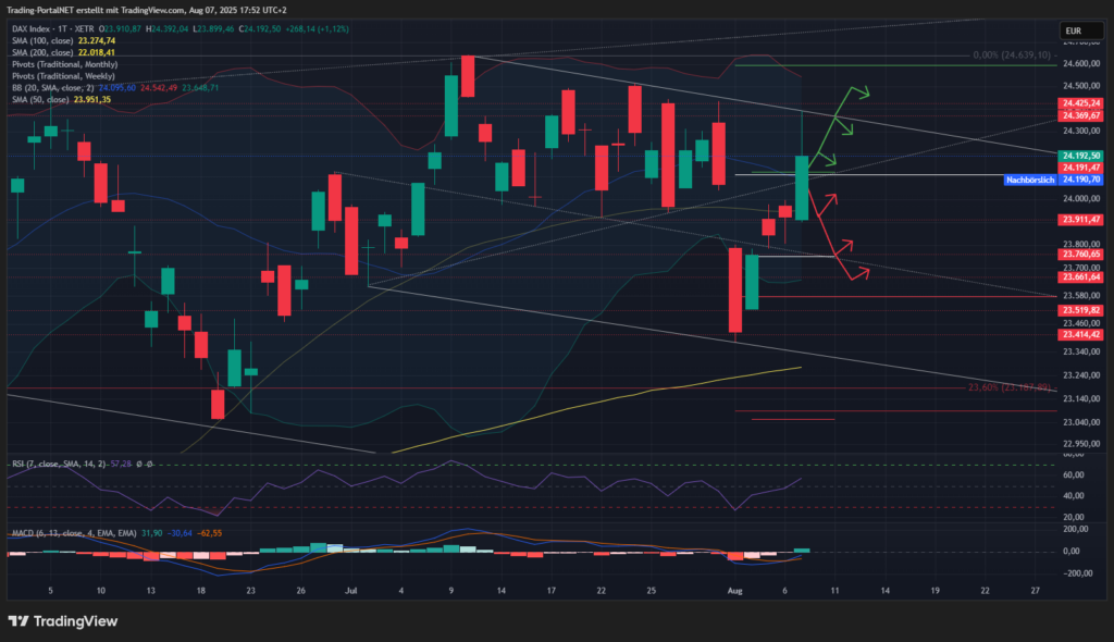 - Oberhalb bleibt der Cluster über die 24.120 zur .190 aktiv. Darüber bleibt die Verbindungslinie an der 24.380 im Fokus. Bei Bruch weitere Aufhellung über die 24.420 zum o. Bollinger bei 24.500.