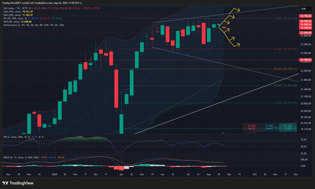 Der DAX testete erneut seine 50-Tageslinie und konnte diesen wichtigen technischen Support bislang verteidigen. Ein nachhaltiger Bruch darunter würde neuen Verkaufsdruck eröffnen. Aktuell bewegt sich der Index aber weiter in seiner Sommer-Range, getragen von defensivem Handelsverhalten.