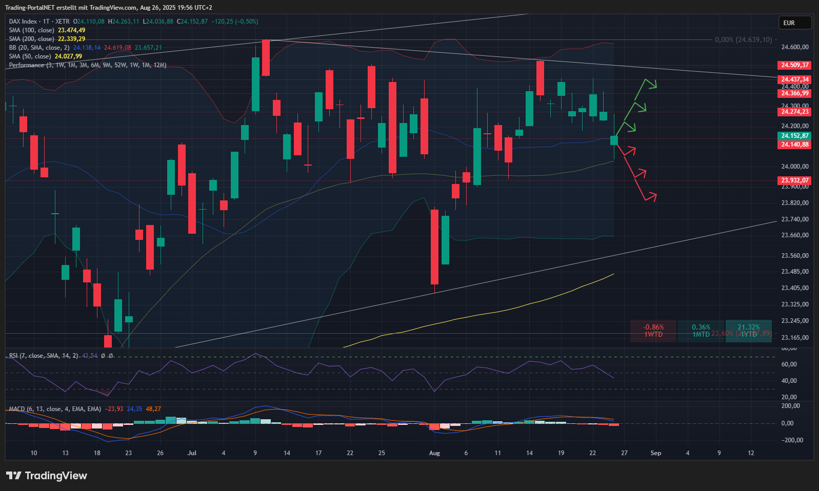 - Oberhalb bleibt der Cluster zur 24.210/.230 im Fokus. Darüber wieder die Chance auf 24.270 und 24.330. Anschließend 24.380/.430.