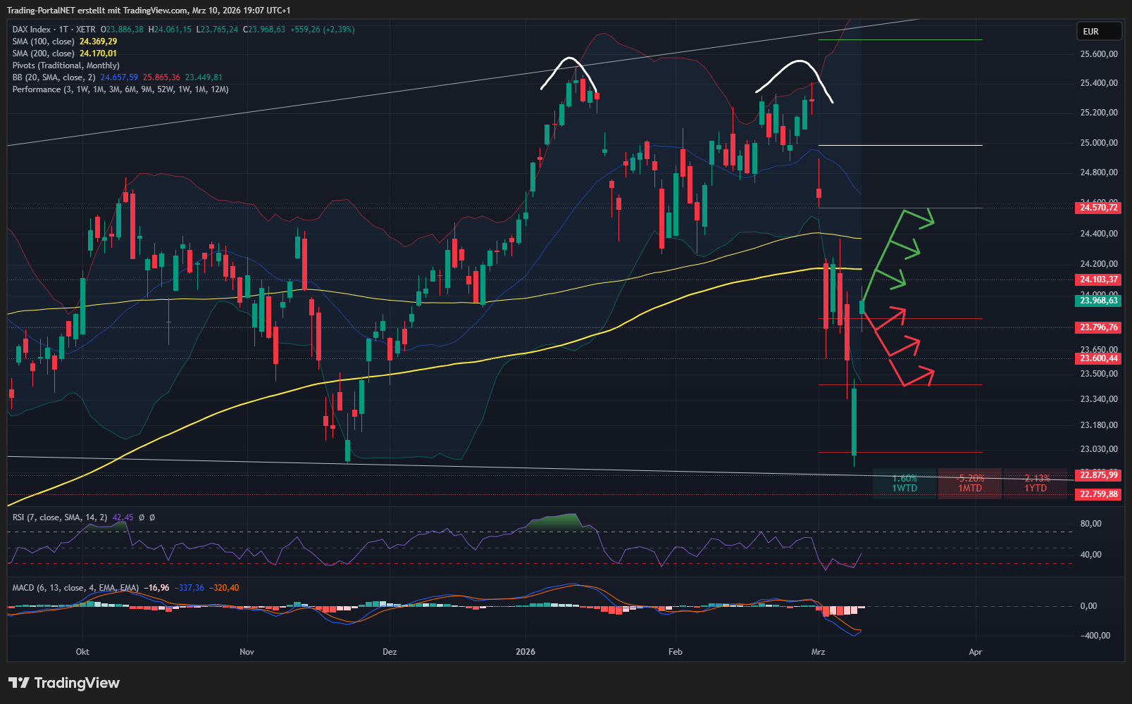 Der DAX mit dem Turnaround Tuesday nach der komplettierten 10% Korrektur am Montag. Der Widerstand an der 200-TL rückt nun wieder in den Blickpunkt. Ohne echte Lösungen im Iran-Konflikt bleibt das Gerüst der Erholung sehr brüchig. Morgen folgen wichtige US-Inflationsdaten.