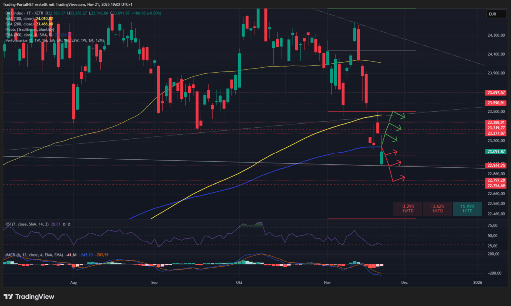 Der DAX schloss sogar unter seiner 200-Tageslinie. Ohne Rücklauf, käme als nächstes Ziel die Gap-Zone 22.800–22.600 Punkte ins Spiel – ein technisch attraktiver Bereich.