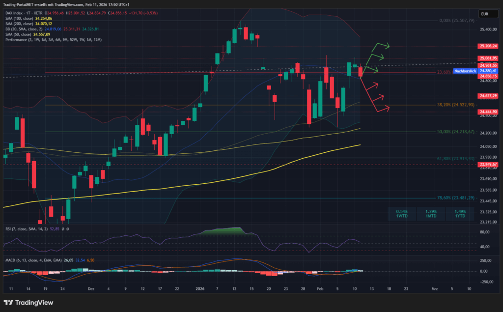 Der DAX müht sich weiter vor der 25k. Erst bei Stabilität oberhalb würde die Gap-Zone an der 25.2 in den Fokus rücken. Unterhalb bleibt die Range zur 50- und 100-Tagelinie aktiv.
