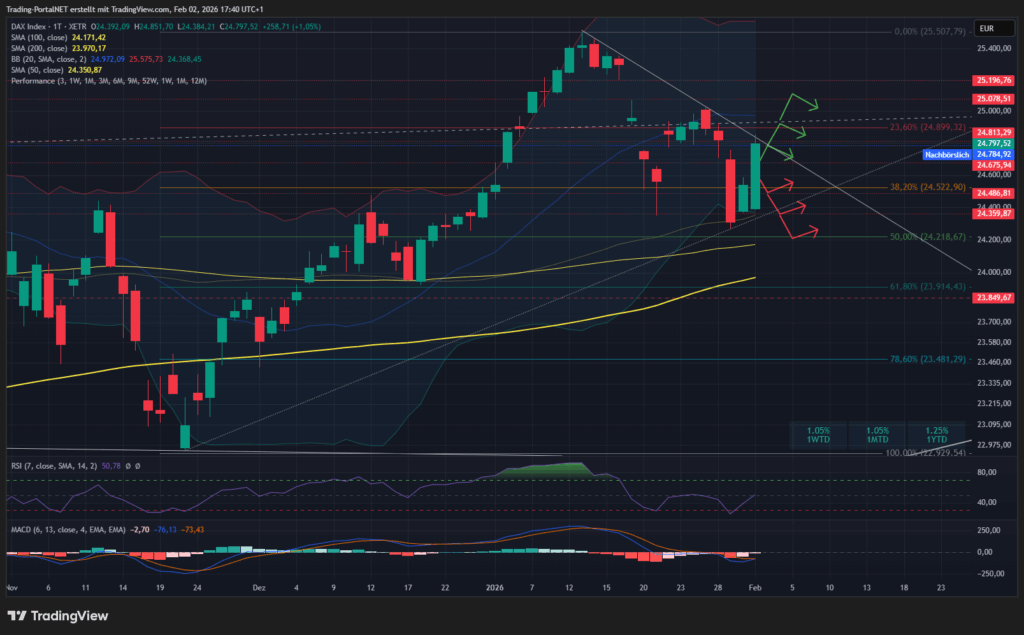Ein schwungvoller Start in den neuen Börsenmonat Februar: Nach einem zunächst sehr schwachen Auftakt – belastet durch Schwäche in Asien sowie extreme Schwankungen bei Krypto und Edelmetallen – wurde der Abverkauf im Kassahandel mehr als nur vollständig aufgekauft. Der DAX-Future spannte dabei eine Range von über 600 Punkten auf und verteidigte klar die 100-Tageslinie. Der Februar macht seinem Ruf als volatiler Monat damit bereits alle Ehre – eine hohe Schwankungsbreite dürfte uns weiter begleiten.