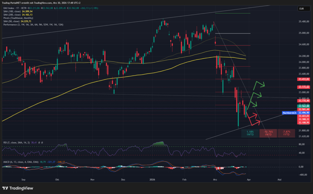 Der DAX mit einer Erholung am Montag, aber weiter mit einer dunkelroten März-Performance. Echte Erholungen & Short-Squeezes werden erst bei nachhaltigen Impulsen zu erwarten sein. Bis dahin bleibt die Schwankungsbreite weiterhin hoch und anspruchsvoll.
