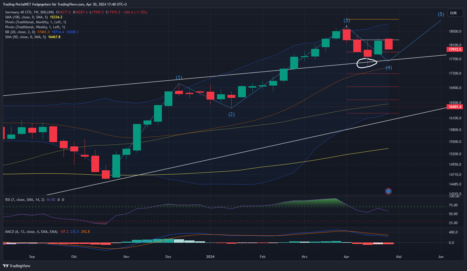 Der Blick auf den Wochenchart, wo der DAX nach 3 Verlustwochen in Folge die Gegenbewegung einleiten konnte. Bei aufkommender Dynamik über die 18.2 würde der DAX sogar noch die Chance einer 5. Welle zum neuen Allzeithoch hochhalten. Die 17.900 stellen die nächstgrößere Supportzone. Oberhalb bleibt eine neutrale Range 18.040 zur 18.200 aktiv. Darüber Chance auf Aufhellung über die .340 Richtung 18.500. Unterhalb bleibt die Abwärtsgefahr aktut mit einem Wochencluster zur 17.740 und anschließend 17.6/.550.