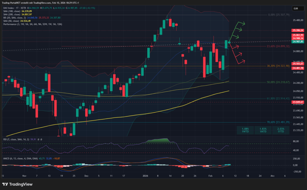 - Oberhalb wäre die Spanne zur 25.060 und anschließend 25.130 aktiv. Darüber Lauf ins Gap-Close bei 25.200. Im Anschluss 25.280 und .350.