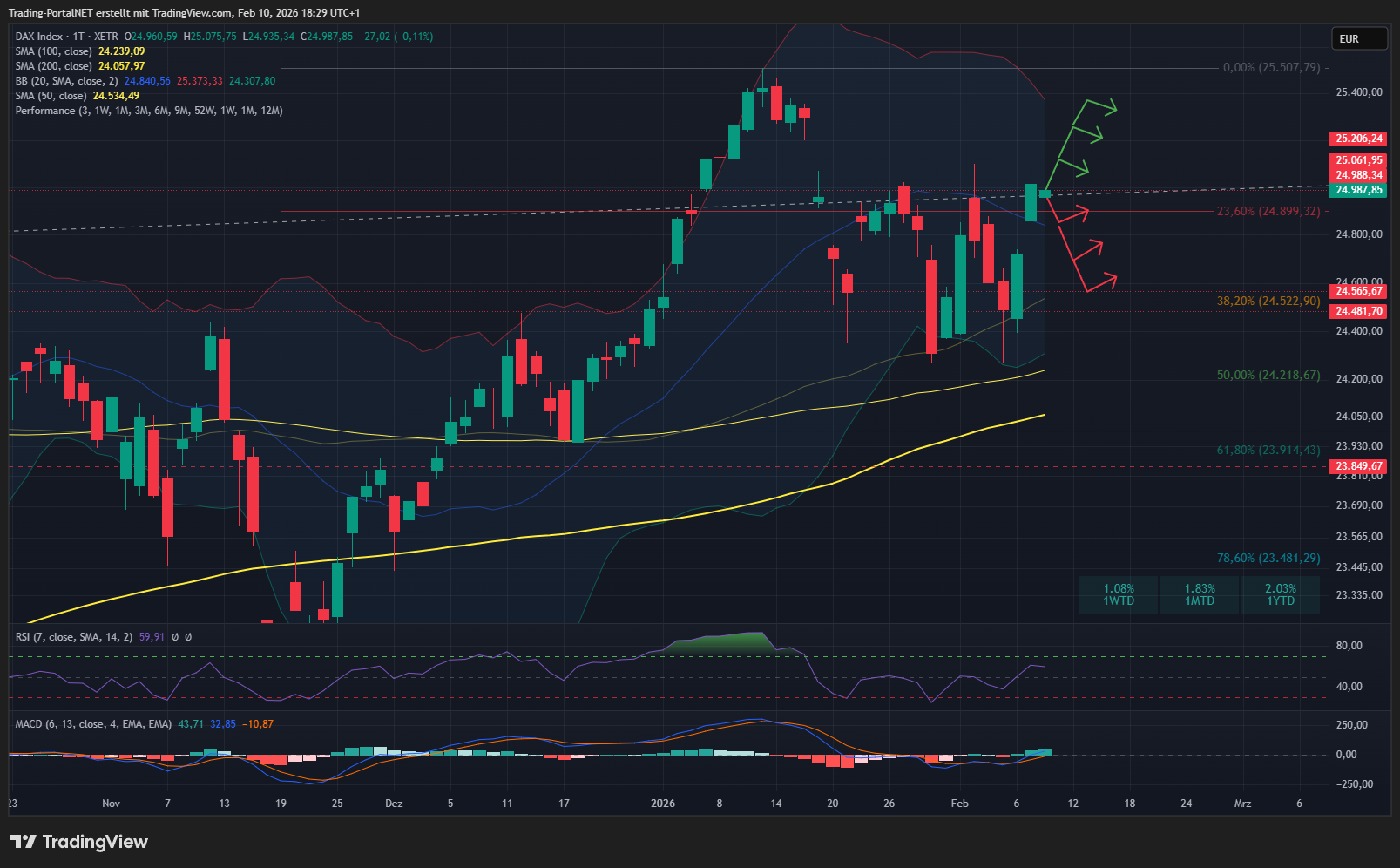 - Unterhalb ist hingegen die Range zur 24.900 und der 24.850 (m. Bollinger) erneut zu nennen. Darunter droht wieder der Lauf zur 24.780, gefolgt von der .700. Bei Bruch öffnet sich wieder die Tür zur 50-TL an der 24.570.