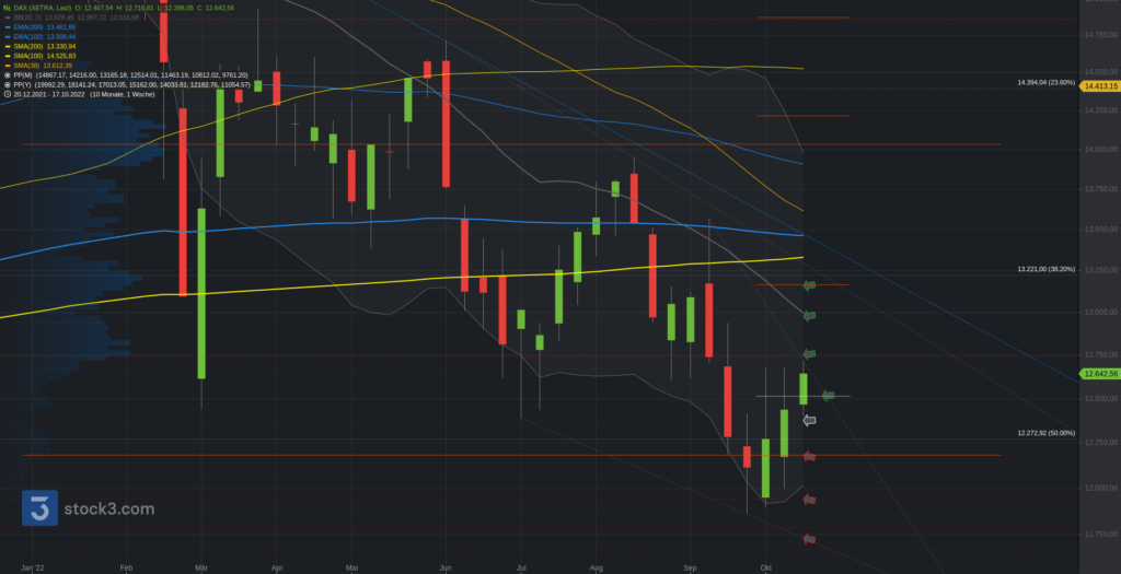 Der Blick zum Wochenchart, wo der DAX eine volatile Wochenkerze innerhalb der Vorwochenkerze zurücklässt. Nervöses Markttreiben. Die 12.370 stellen einen ersten relevanten Bereich.