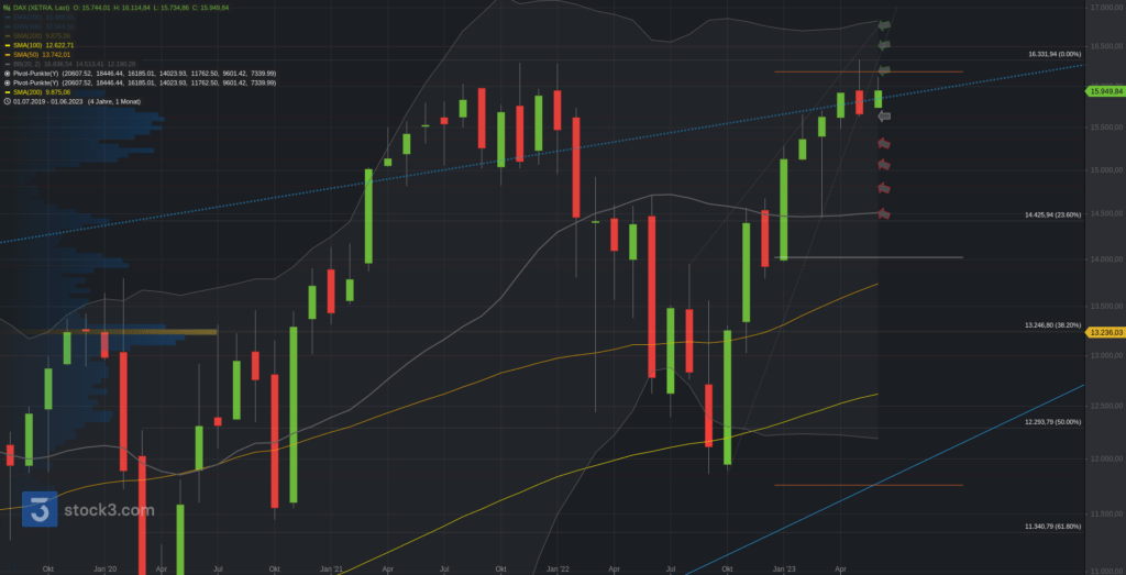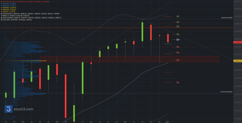 Oberhalb bleibt der Cluster über die 16.075 aktiv. Darüber folgen die 16.120 und der Kombiwiderstand .185/.200. Anschließend 16.280 und der Weg zum neuen AZH .330/.370.