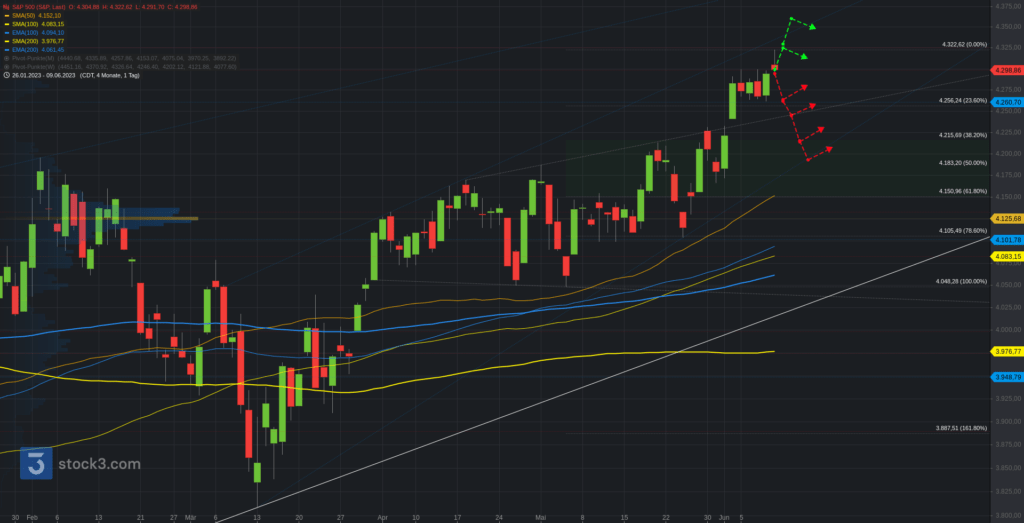 Ein kurzer Blick in den US-Markt (Komplette Updates für den US-Markt gibt es auf Trading-Portal.NET – Premium) ins übergeordnete Bild. Der S&P500 konnte am Freitag bis an sein Sommerhoch 2022 laufen, aber tendierte kurz davor zu Schwäche. Die Impulsbewegung könnte vor dem Abschluss stehen und eine Konsolidierung vorbereiten. Die 4.3 stellen einen ersten relevanten Bereich. Oberhalb bleibt die Range zur 4.325 aktiv. Darüber weitere Erholung zur 4.340. Bei Bruch 4.380. Unterhalb rücken hingegen wieder die 4.260 in den Blickpunkt. Darunter könnte die Konsolidierung über die .245 zur .215 an Fahrt aufnehmen. Bei Bruch 4.185. Anschließend 4.150.