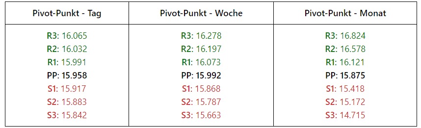 Unterhalb stellen hingegen die 15.870 einen ersten Cluster. Darunter folgen die 15.780. Bei Bruch erneut der Test der Supportzone .660/.630.
